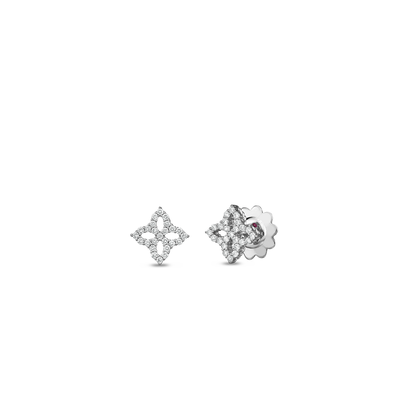 These 18K white gold small flower stud earrings feature a refined diamond outline that enhances their delicate floral design. Expertly crafted, they offer both timeless elegance and subtle sparkle, making them an ideal choice for adding a touch of sophistication to everyday wear or special occasions. Their secure stud setting ensures comfortable, enduring wear.
