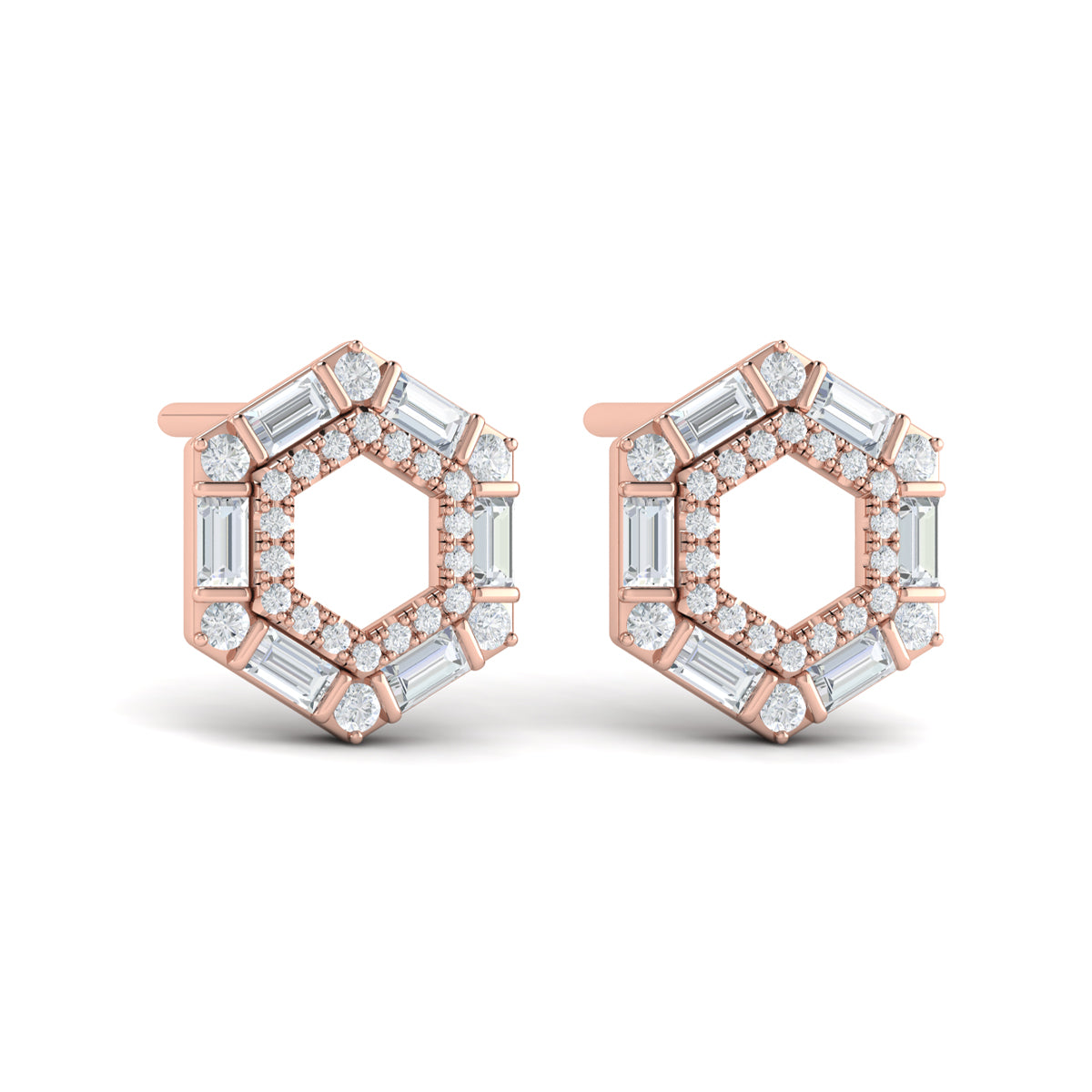 Diamond Baguette Double Row Open Honeycomb Stud Earrings