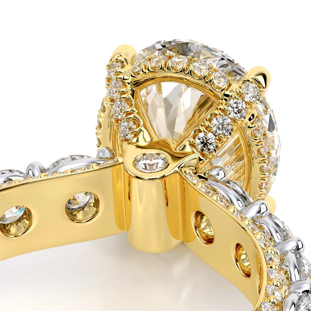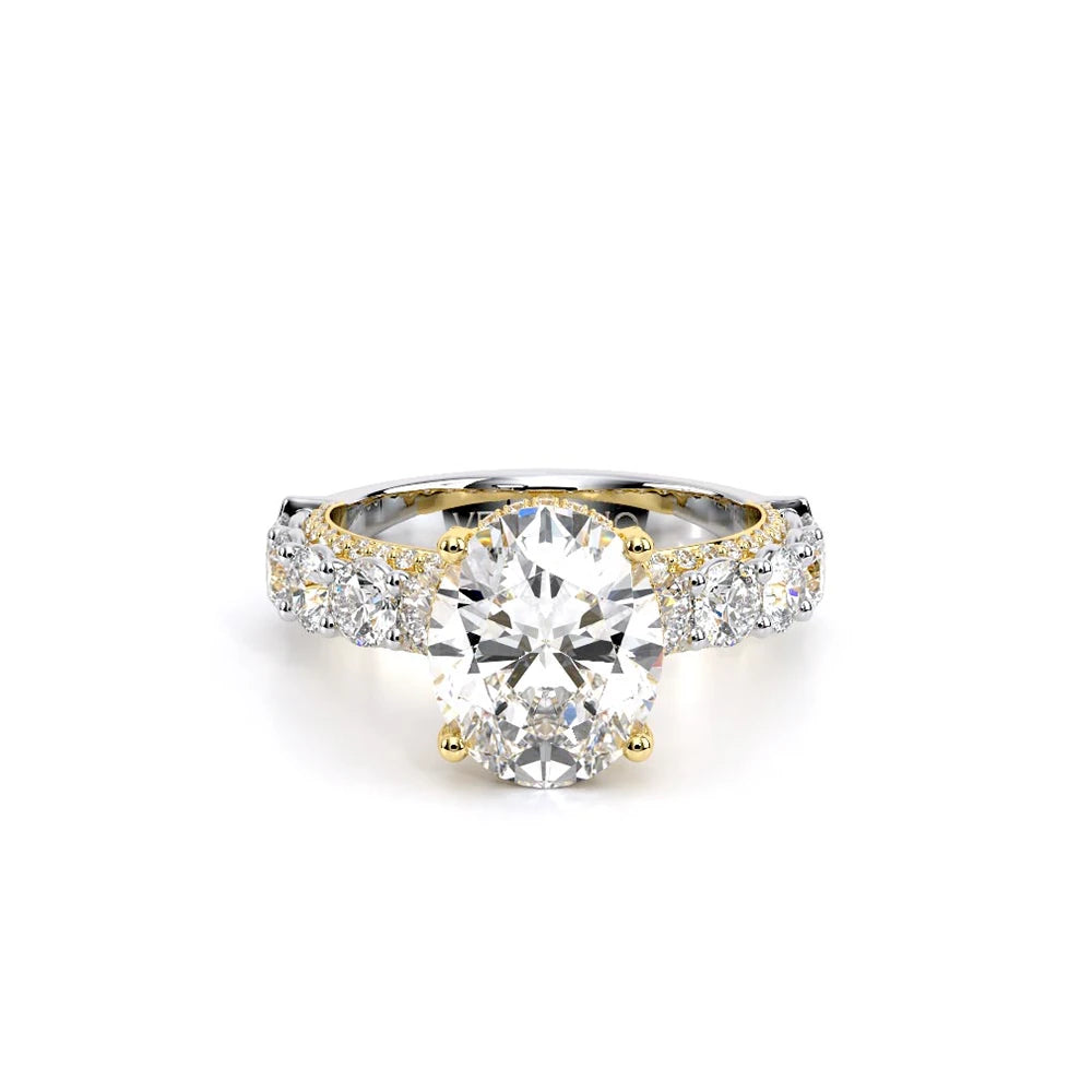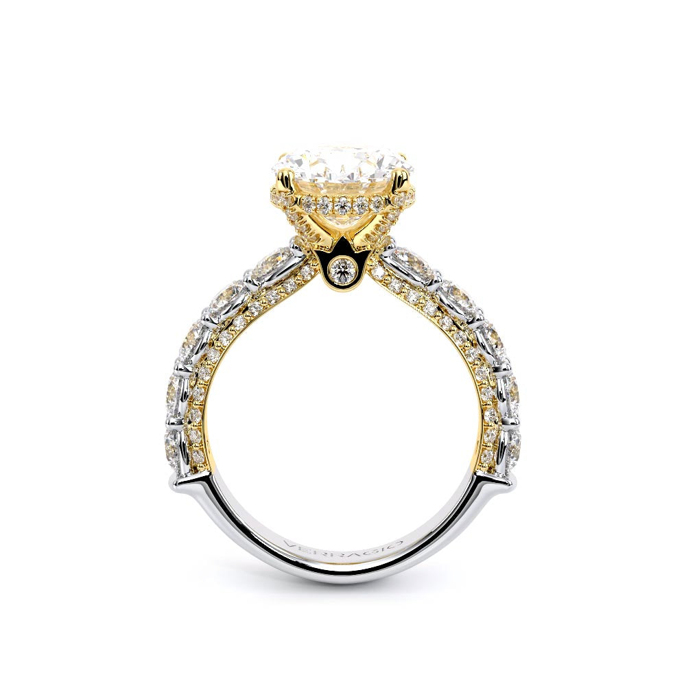 Couture-0489OV-3.4 is an elevated four-prong engagement ring featuring a diamond-bridge head designed to highlight your center stone. Meticulously-set round diamonds in a shared-prong setting wrap the elegant shank, enhanced with a pave-set three-quarter diamond riviera. The Verragio signature crest completes the statement look.