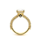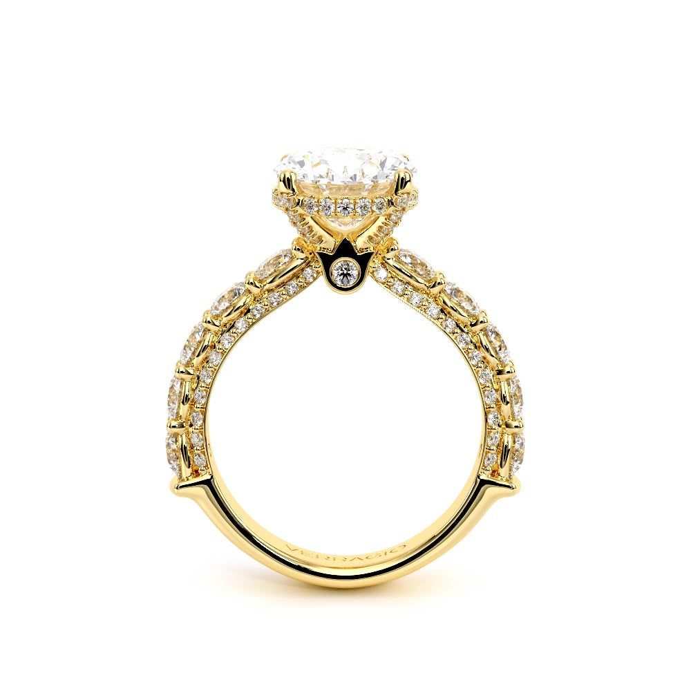 Couture-0489OV-3.4 is an elevated four-prong engagement ring featuring a diamond-bridge head designed to highlight your center stone. Meticulously-set round diamonds in a shared-prong setting wrap the elegant shank, enhanced with a pave-set three-quarter diamond riviera. The Verragio signature crest completes the statement look.