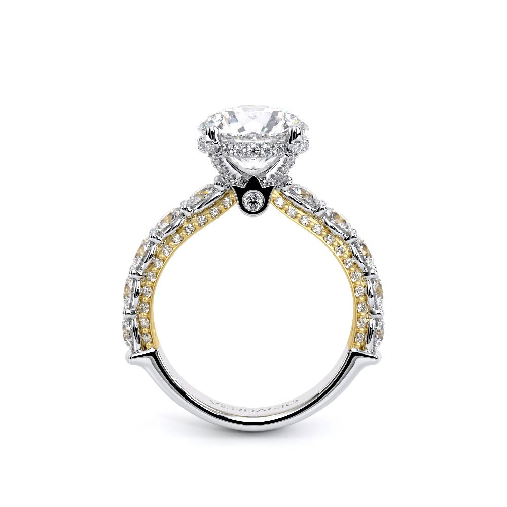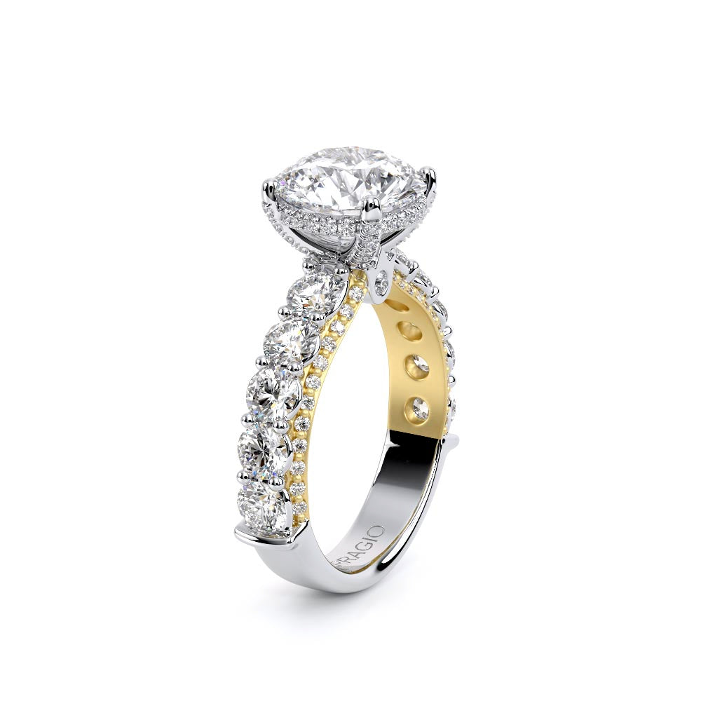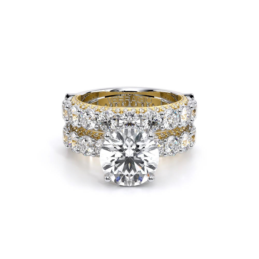 Couture-0489R-3.4 is an elevated four-prong engagement ring featuring a diamond-bridge head designed to highlight your center stone. Meticulously-set round diamonds in a shared-prong setting wrap the elegant shank, enhanced with a pave-set three-quarter diamond riviera. The Verragio signature crest completes the statement look.