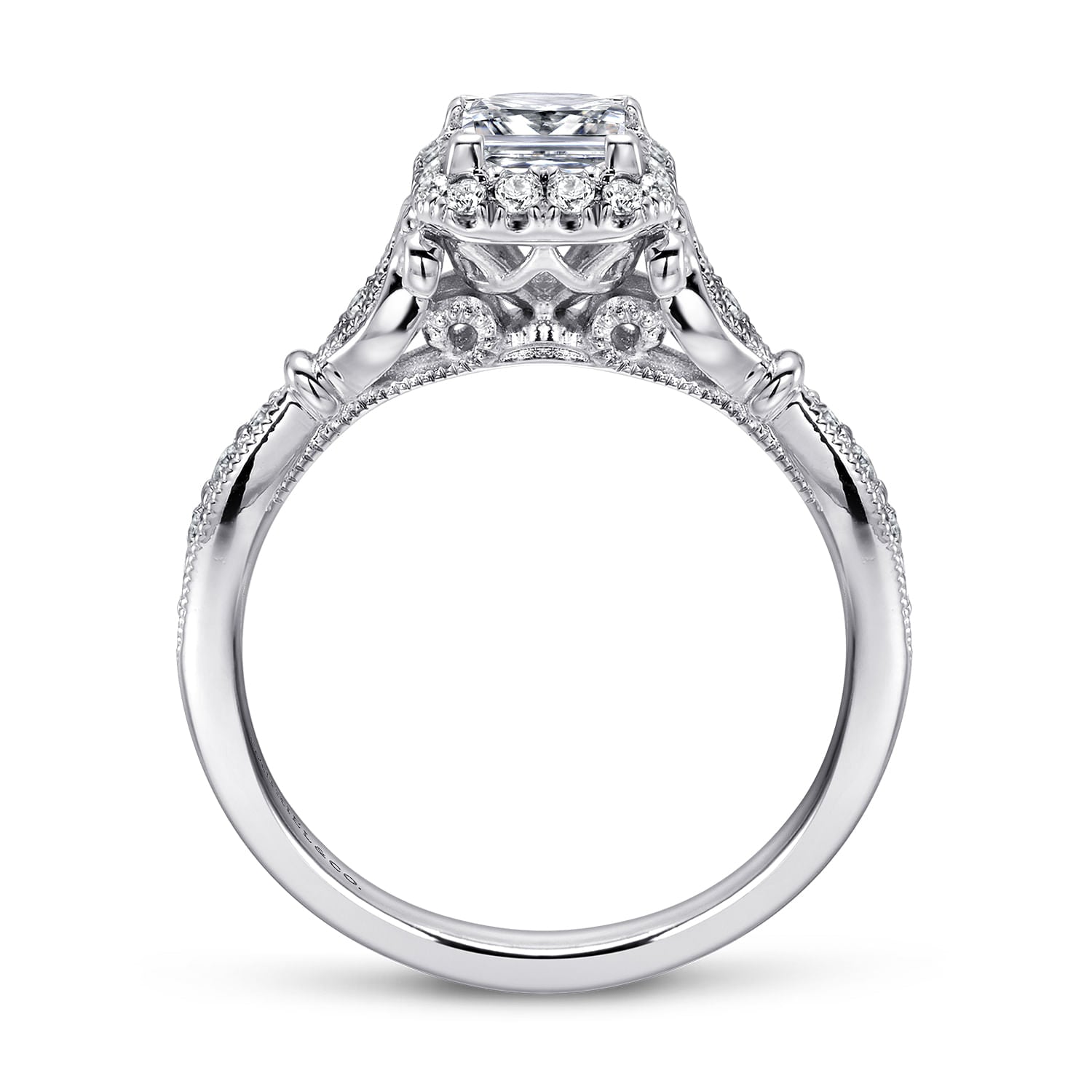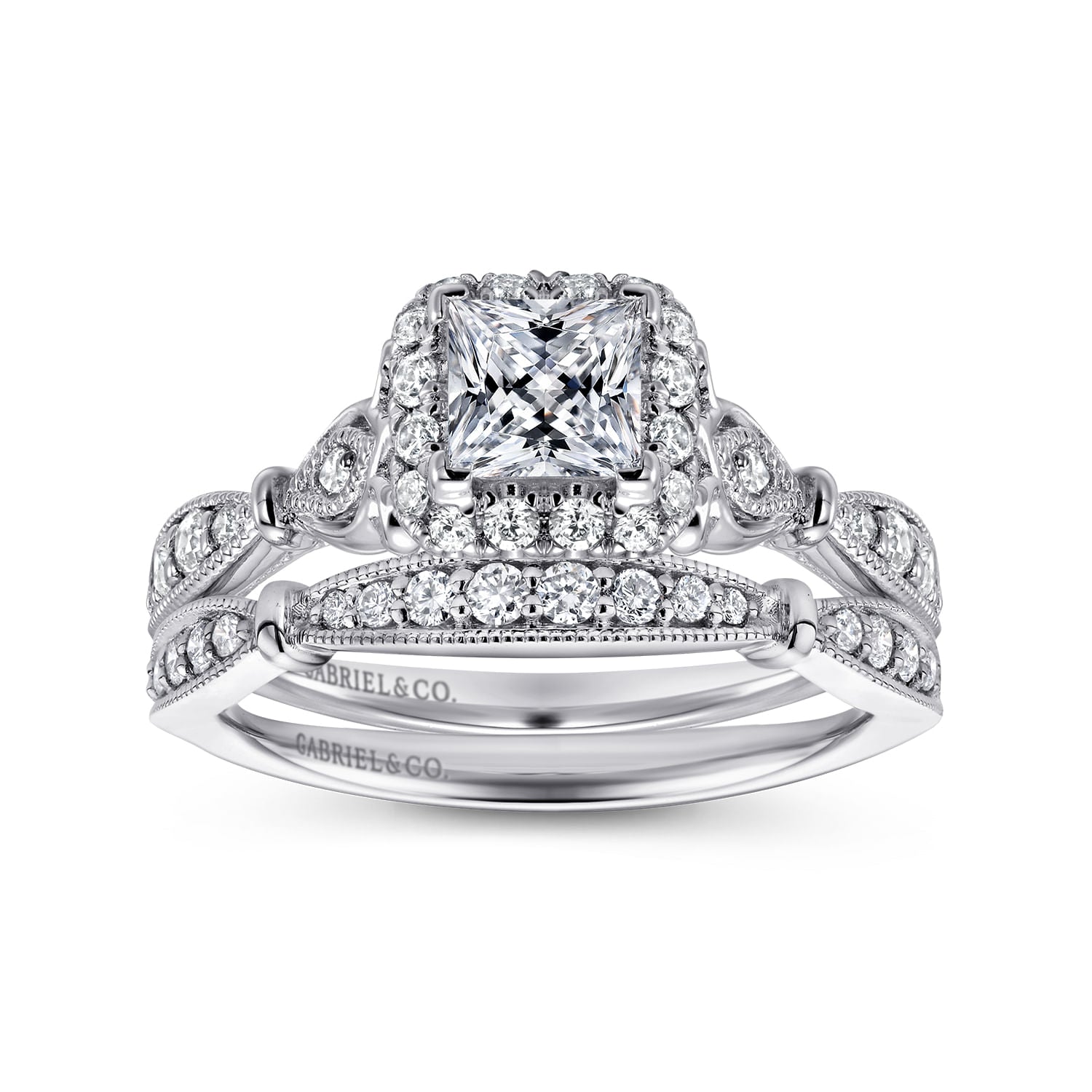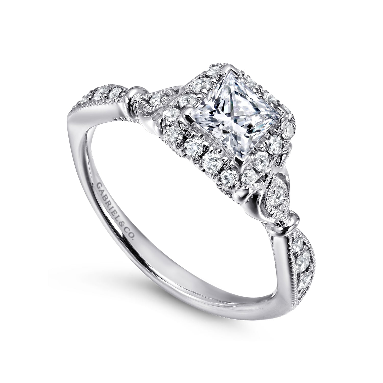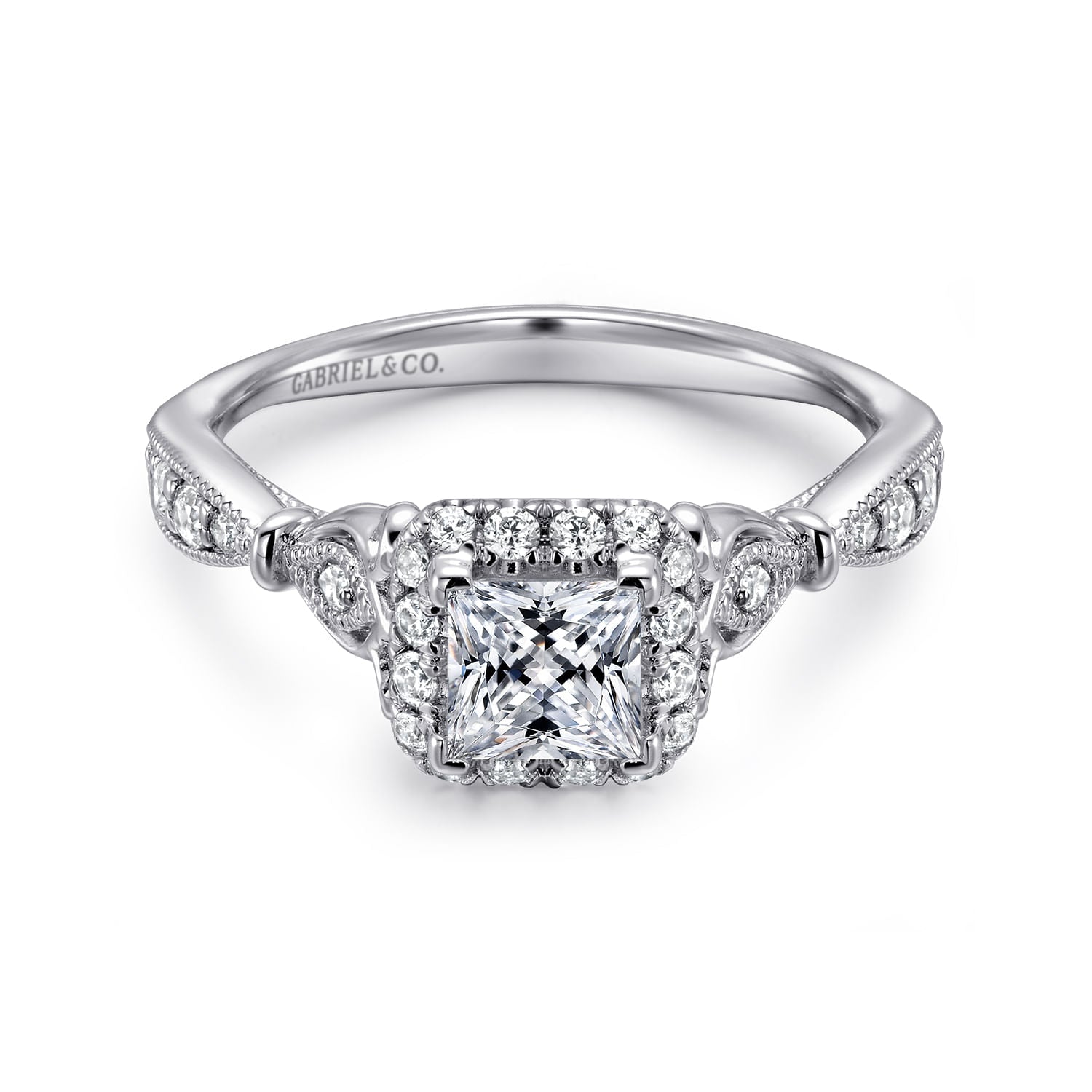 Vintage Inspired 14K White Gold Princess Halo Diamond Engagement Ring