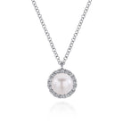 14K White Gold Cultured Pearl and Diamond Halo Pendant Necklace