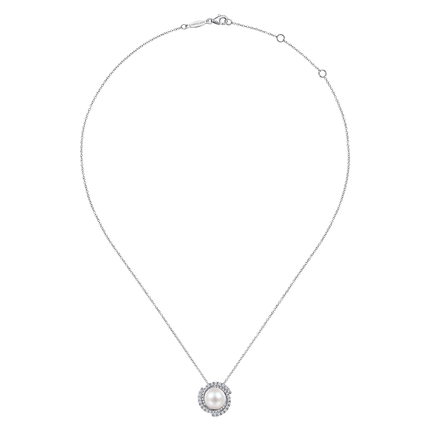 You're reviewing: 14K White Gold Round Cultured Pearl Swirling Diamond Halo Pendant Necklace
