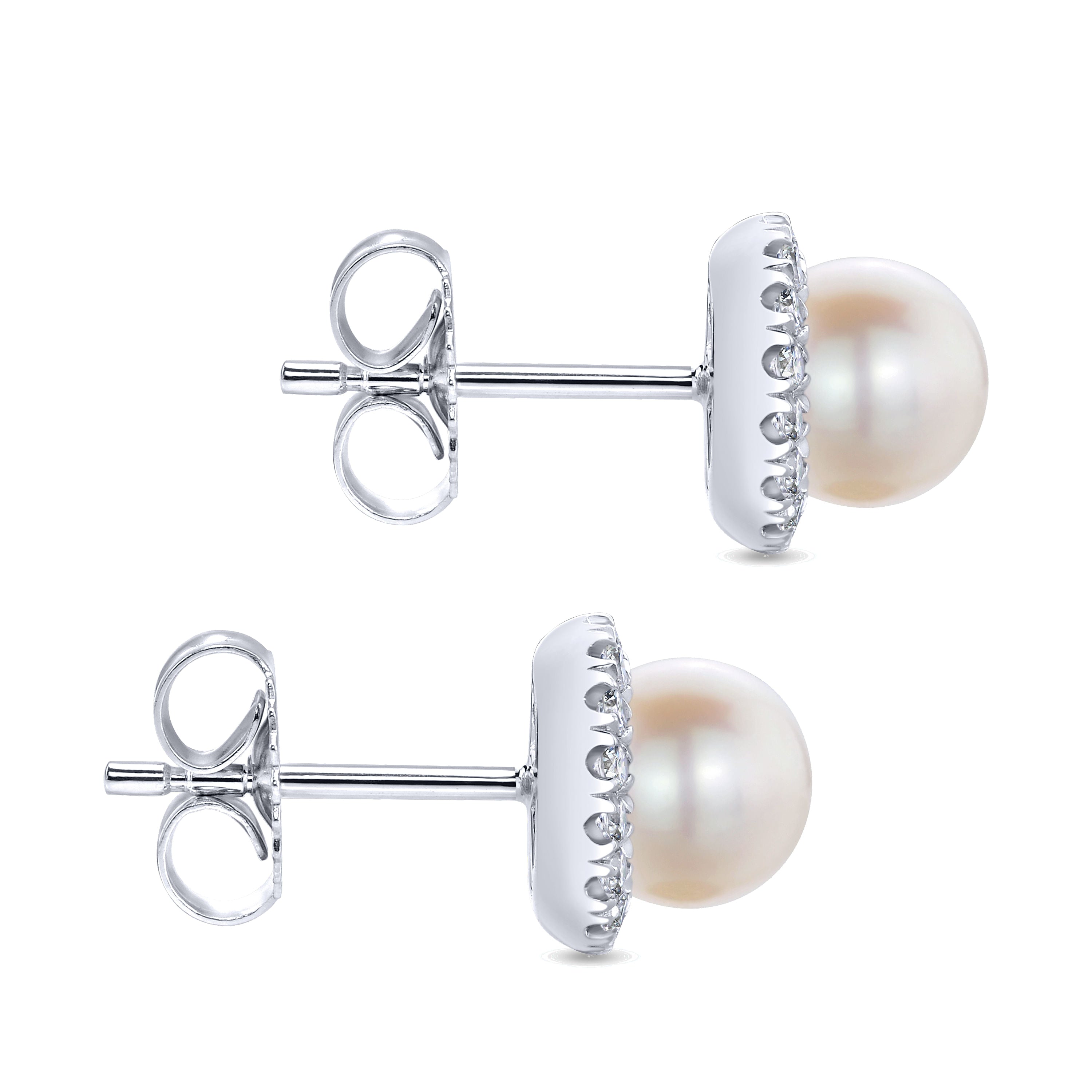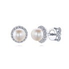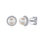 14K White Gold Round Diamond Halo Pearl Stud Earrings