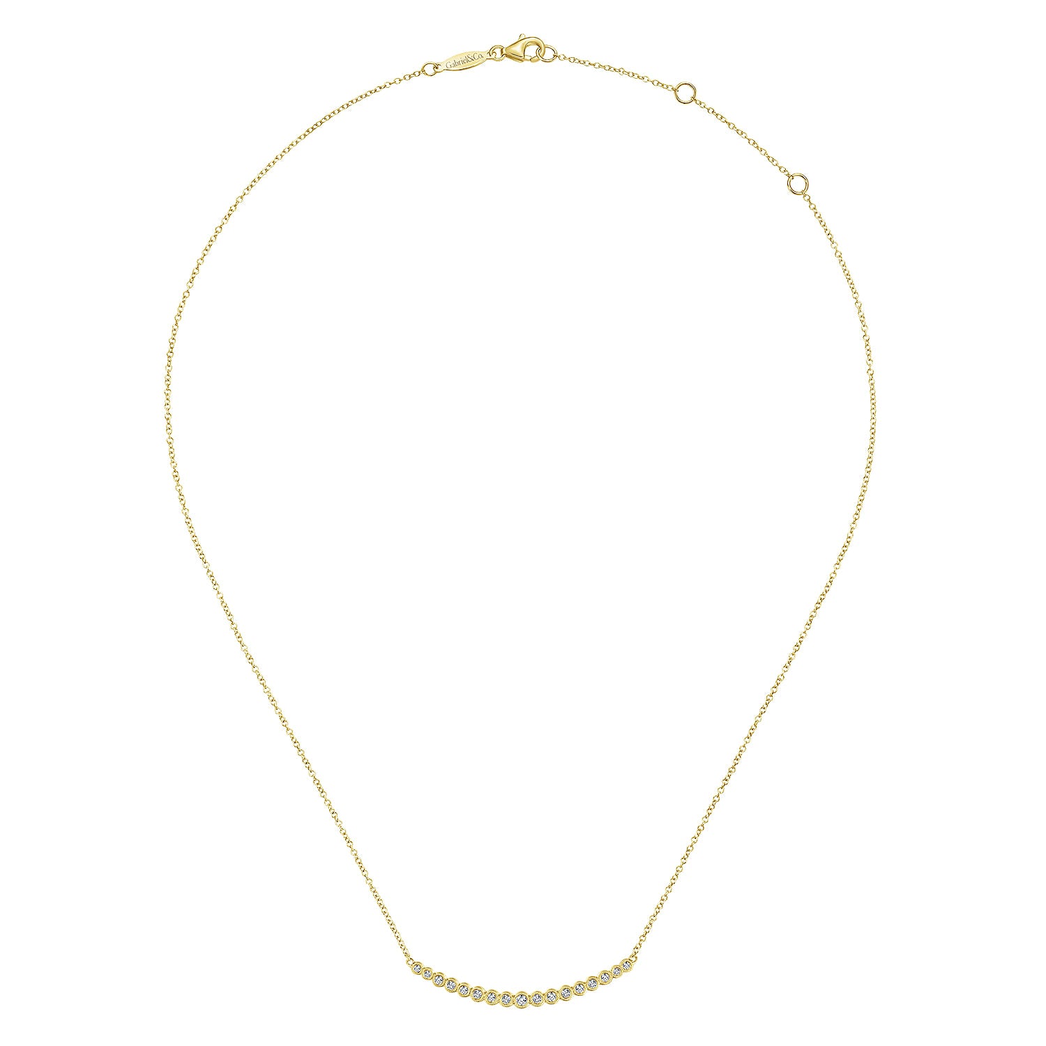 You're reviewing: 14K Yellow Gold Curved Bar Necklace with Bezel Set Round Diamonds