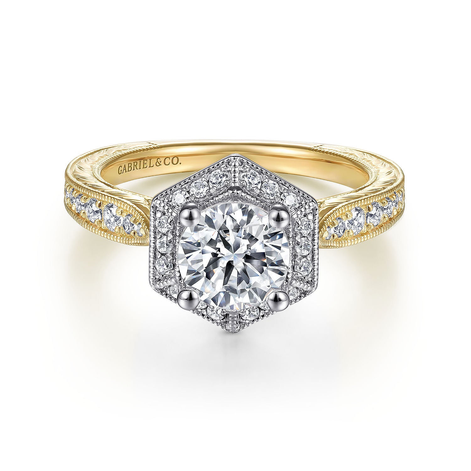 Art Deco 14K White-Yellow Gold Hexagonal Halo Round Diamond Engagement Ring