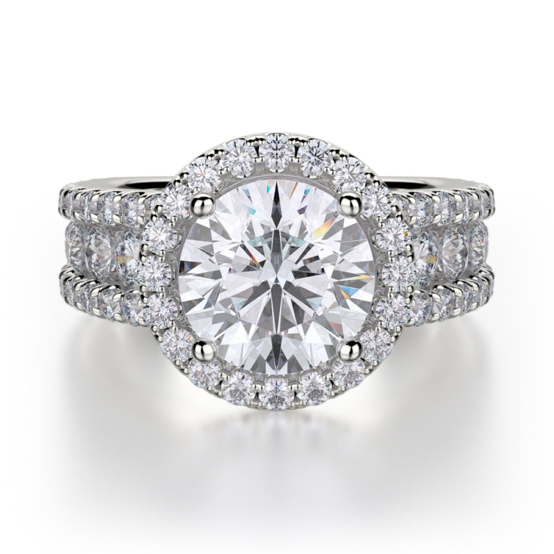 This Michael M engagement ring is displayed with a round center diamond (not included at time of purchase); holds 1.85 to 2.10 CTs. Adorned with 1.40 CTs in a prong setting. Available in Yellow and Rose 18k Gold. Price varies in Platinum.