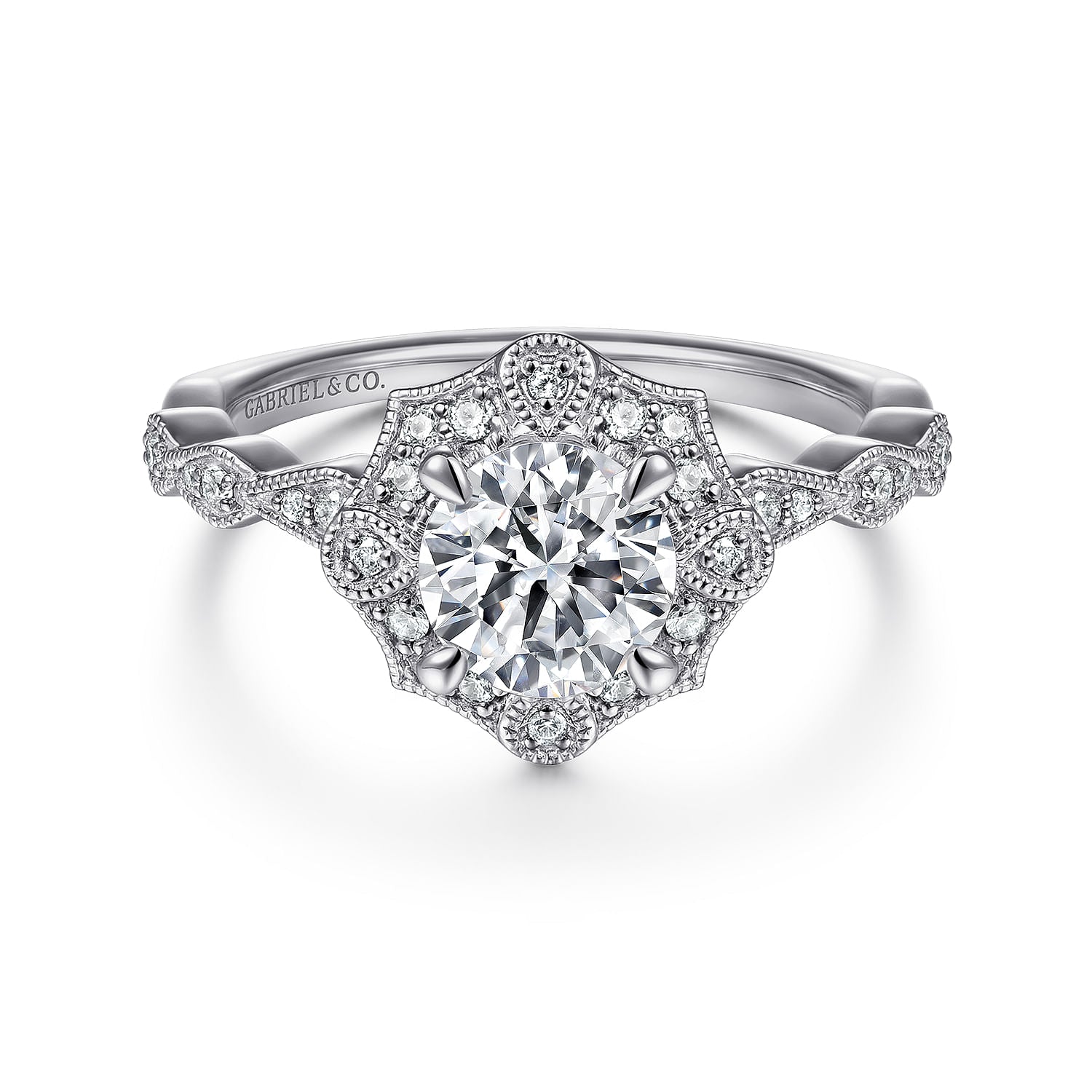 Unique 14K White Gold Art Deco Halo Diamond Engagement Ring