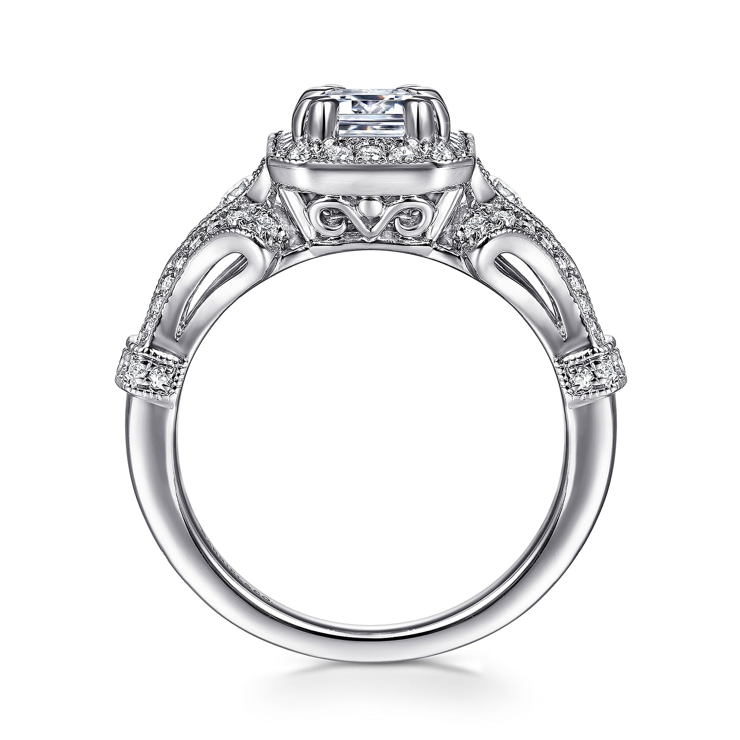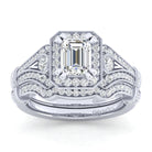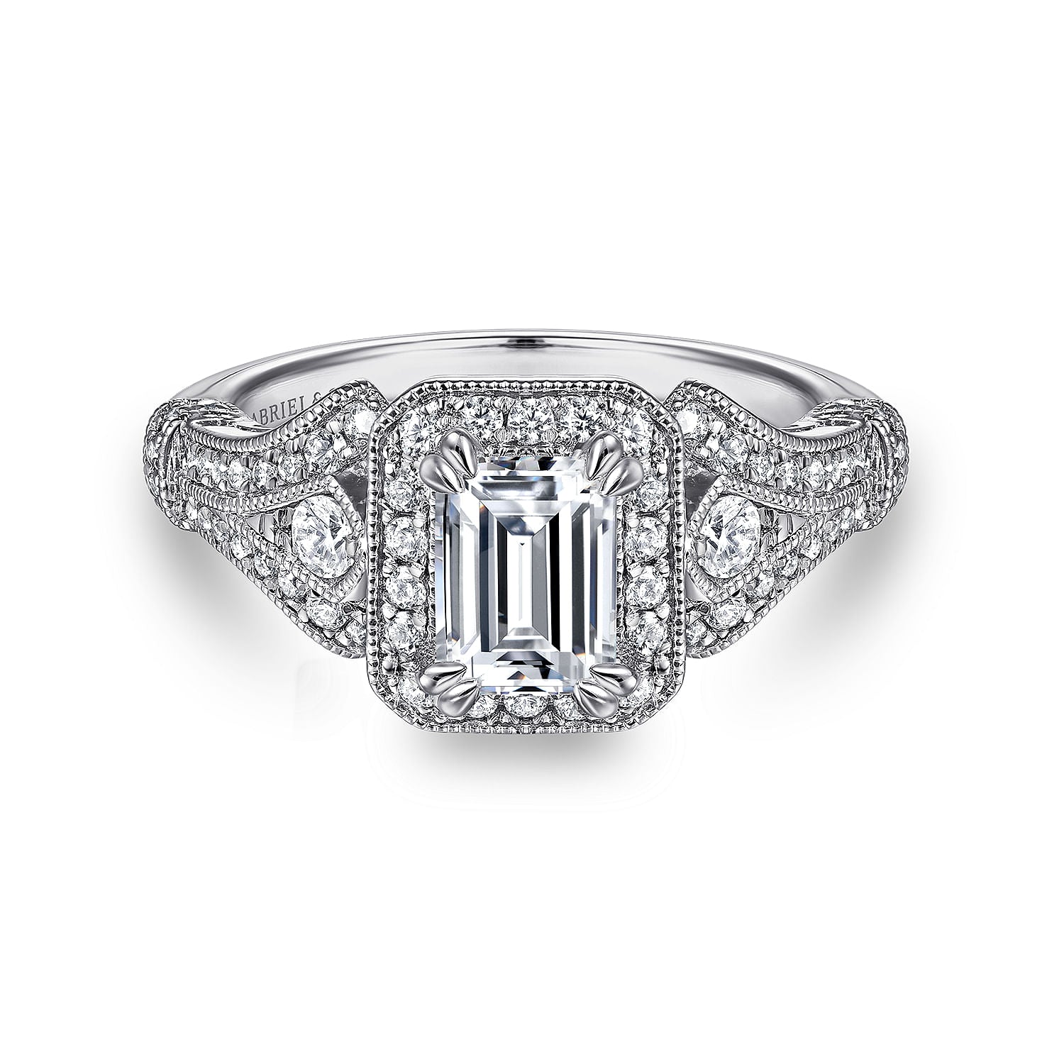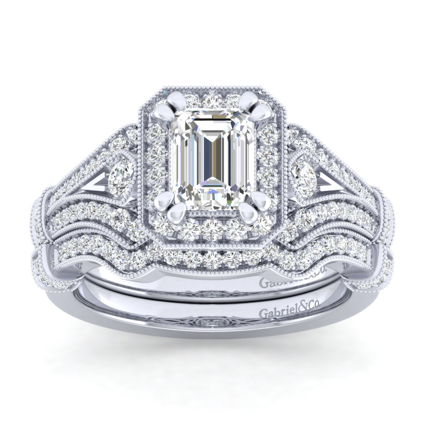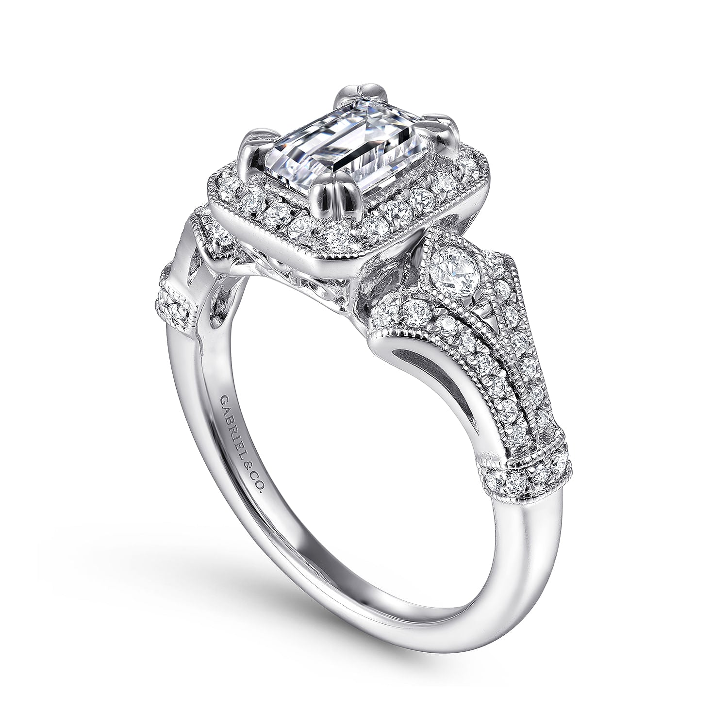 Vintage Inspired 14K White Gold Halo Emerald Cut Diamond Engagement Ring
