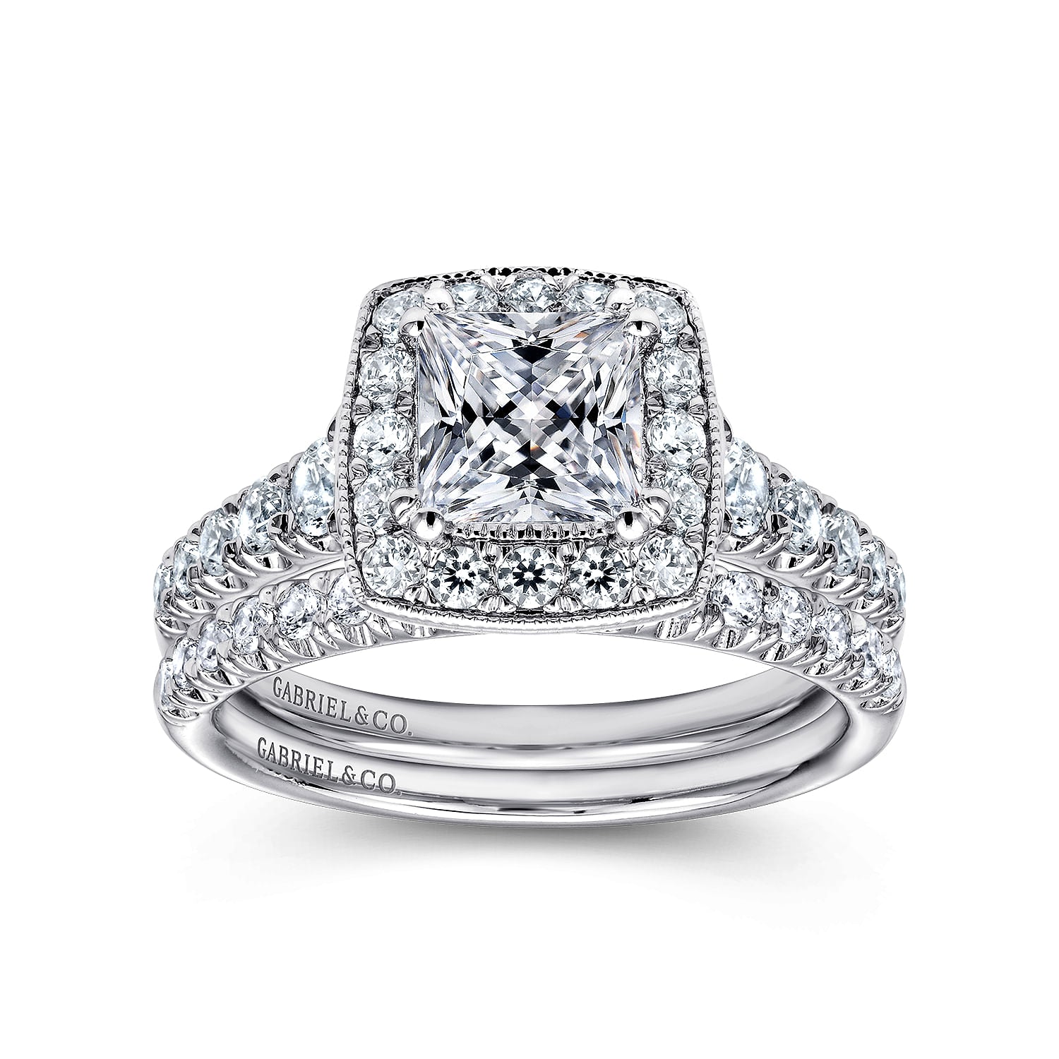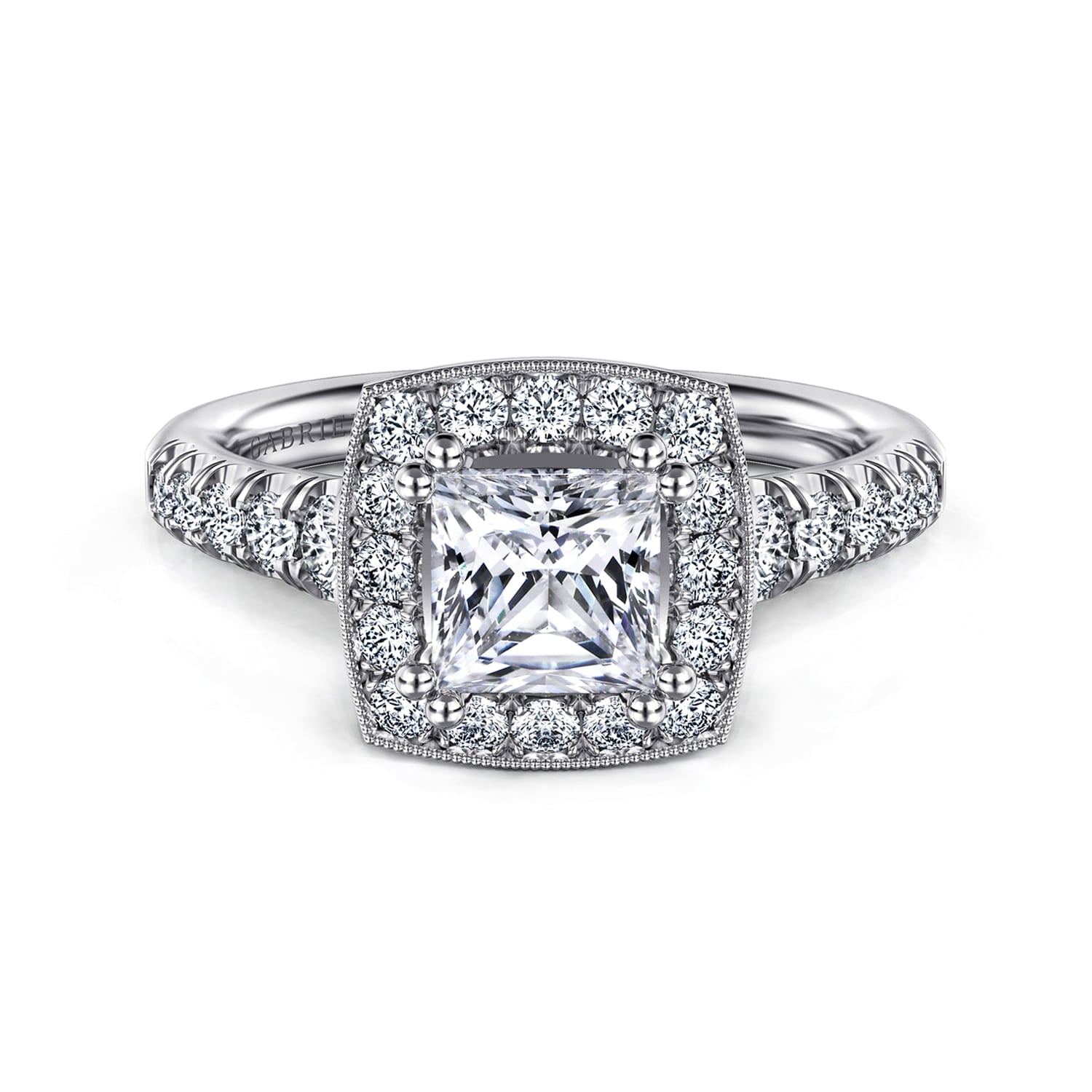 Vintage Inspired 14K White Gold Princess Halo Diamond Engagement Ring