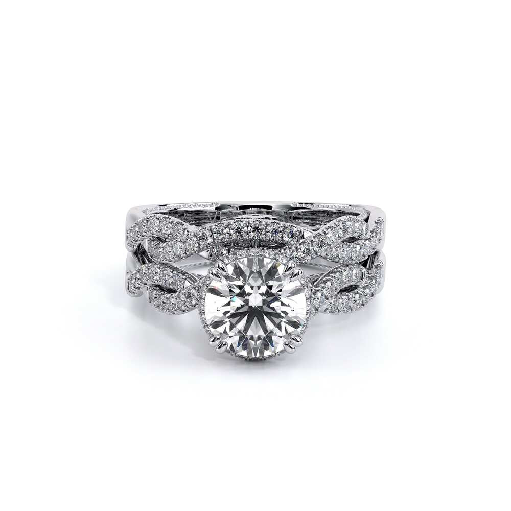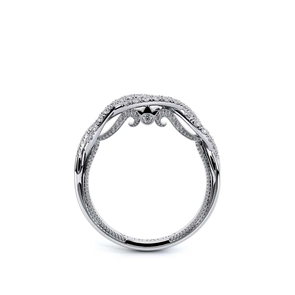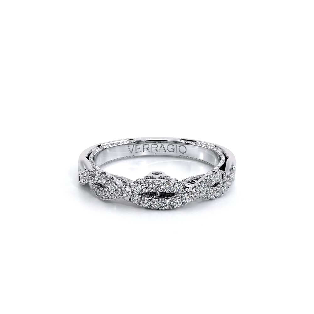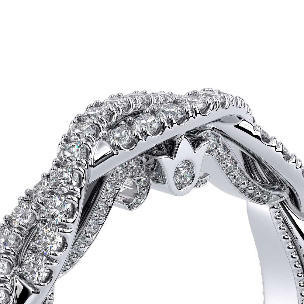 INSIGNIA-7099W diamond wedding ring from the Insignia Collection. Featuring round brilliant-cut diamonds pave set on a twisted band. Distinguished by handcrafted diamond Insignia scrollwork amid Verragio's signature beading and crest.