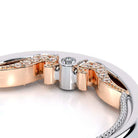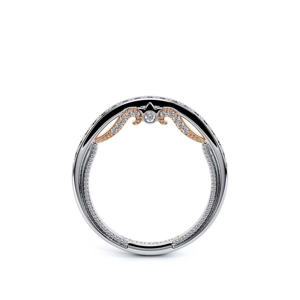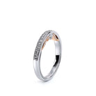 INSIGNIA-7107W diamond wedding ring from the Insignia Collection, featuring round brilliant-cut diamonds channel set on a straight band. Adorned with handcrafted diamond Insignia scrollwork accompanied by Verragio's signature crest and beading.