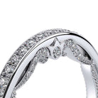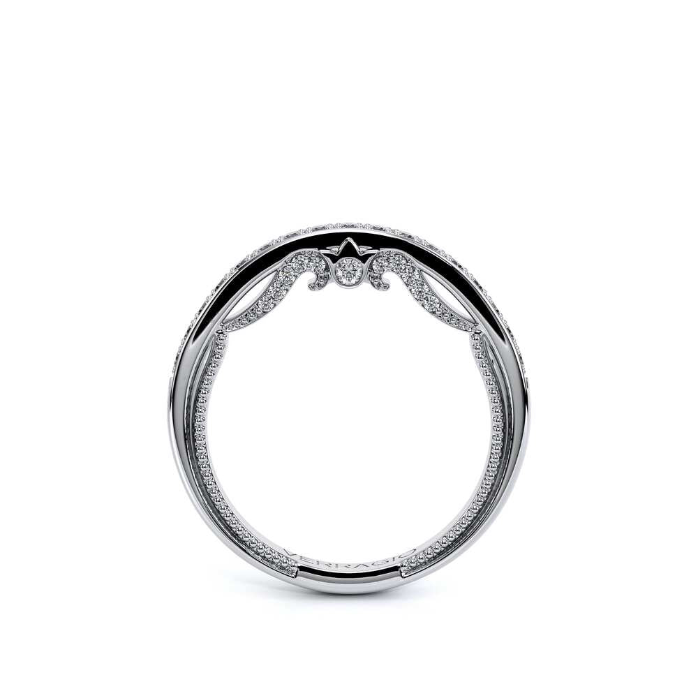 INSIGNIA-7107W diamond wedding ring from the Insignia Collection, featuring round brilliant-cut diamonds channel set on a straight band. Adorned with handcrafted diamond Insignia scrollwork accompanied by Verragio's signature crest and beading.