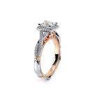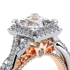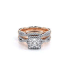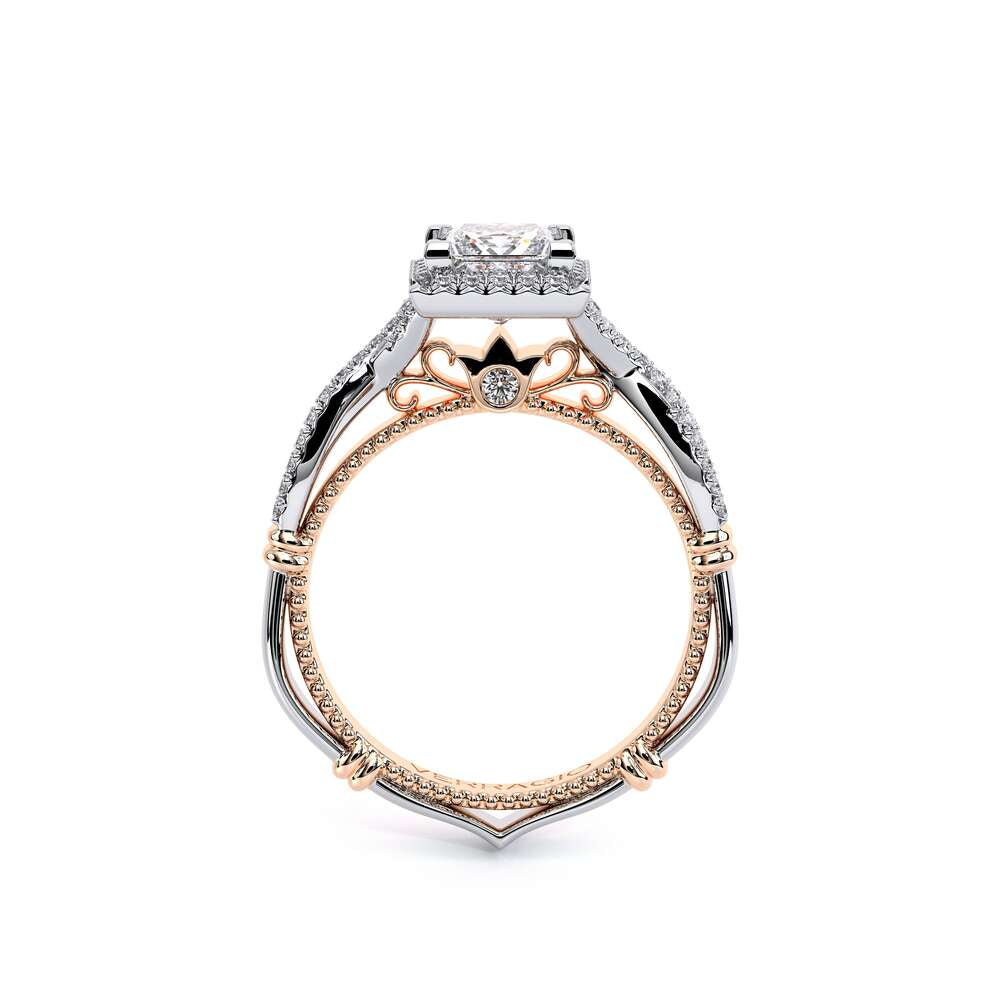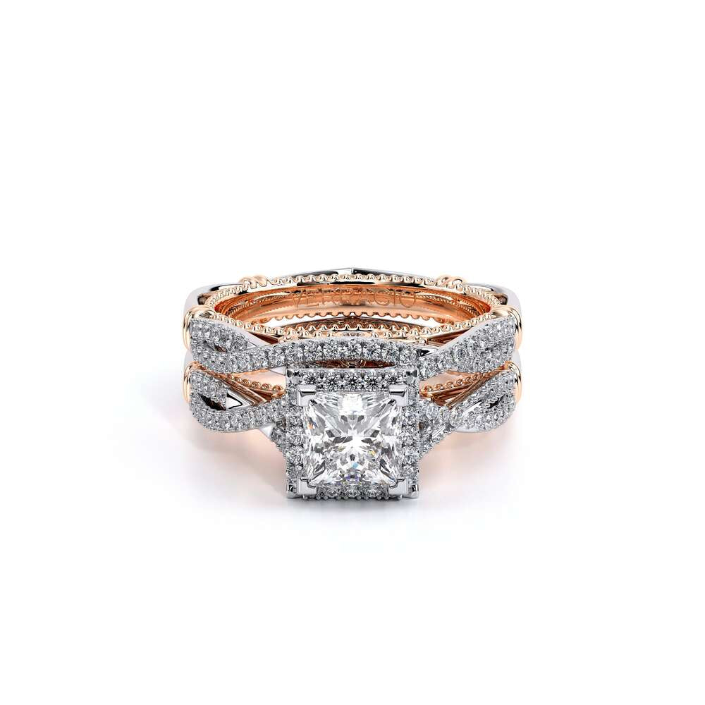 Parisian-106P is a classic engagement ring that features pave set twisted diamond band showcasing a brilliant princess halo, Parisian Lace detail, our Verragio signature beading and lastly adorned with rose gold Timeless wraps.