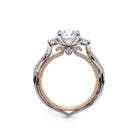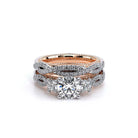 COUTURE-0450R Timeless Twist Round three stone Engagement ring that features a pave set cathedral diamond band, the subtle sparkle of our half diamond Riviera, adorned with the Verragio Crest and Signature Beading, completed with the Couture shank.