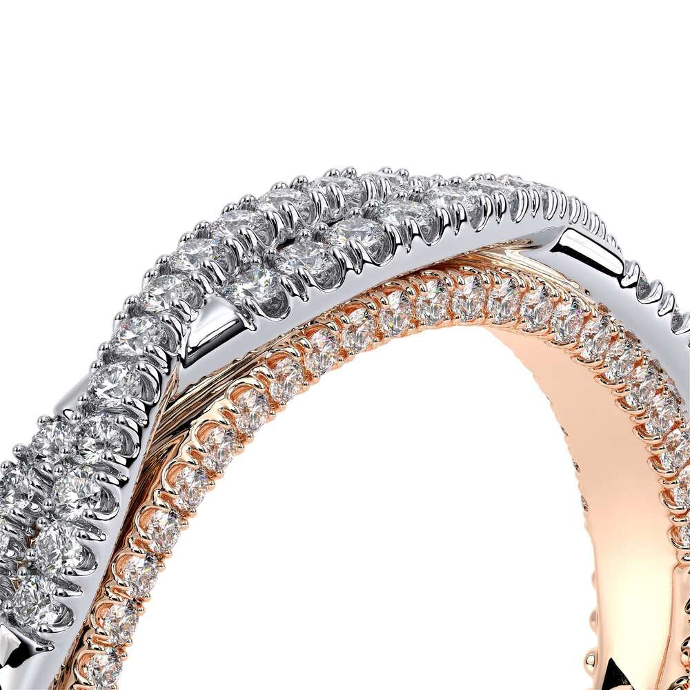 COUTURE-0450W Elegant Twist Wedding band pave with round brilliant diamonds, featuring Half Diamond Riviera-Signature Beading profile, completed with the Couture pointed shank.