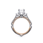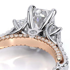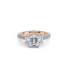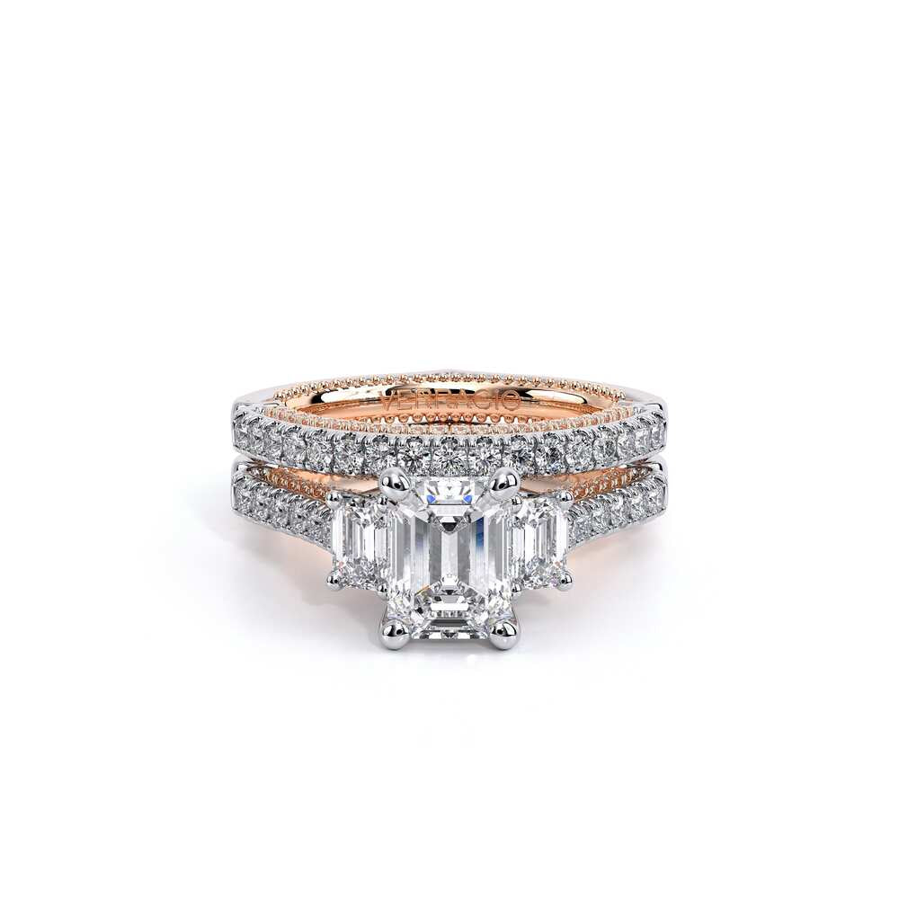 COUTURE-0470EM Beautiful Emerald three stone Engagement ring pave set with round brilliant diamonds, adorning the Verragio Crest and half Diamond Riviera along with our Verragio Signature Beading profile, completed with the Couture shank.