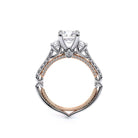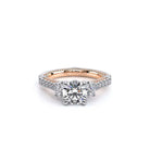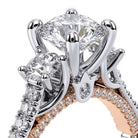 COUTURE-0470R Beautiful Round three stone Engagement ring pave set with round brilliant diamonds, adorning the Verragio Crest and half Diamond Riviera along with our Verragio Signature Beading profile, completed with the Couture shank.