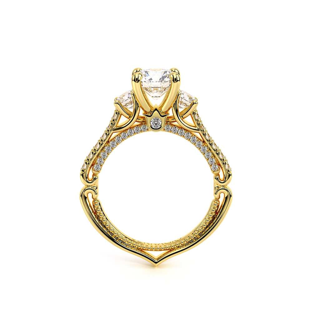 COUTURE-0470R Beautiful Round three stone Engagement ring pave set with round brilliant diamonds, adorning the Verragio Crest and half Diamond Riviera along with our Verragio Signature Beading profile, completed with the Couture shank.