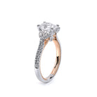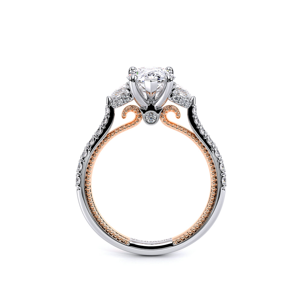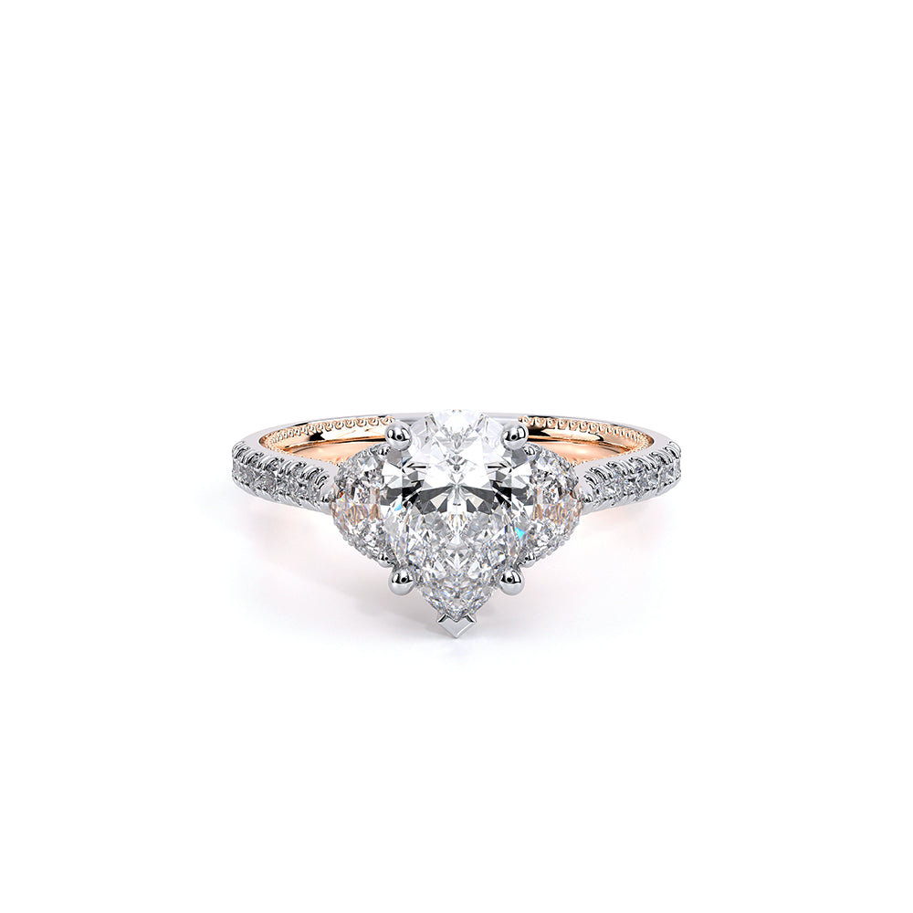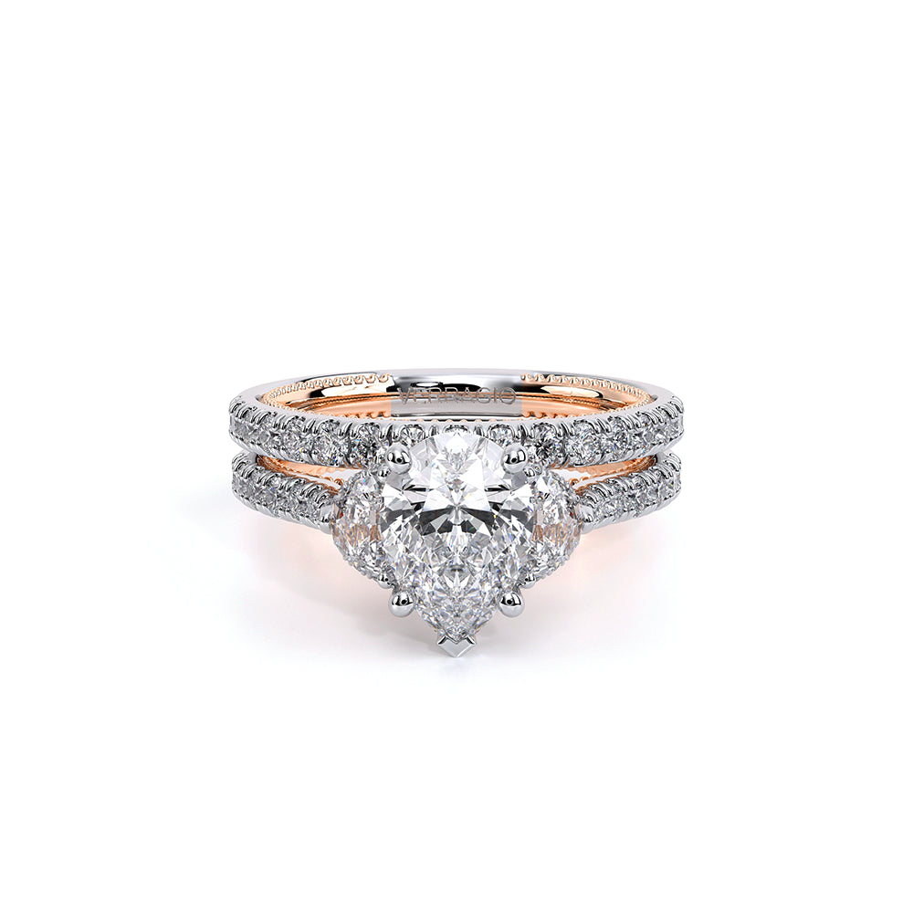 Couture-0485PS is a distinctive three-stone engagement ring featuring half-moon diamond side-stones. The diamond shank is adorned with Verragio signature beading and beautiful scrolls sweep under the center mounting. The Verragio signature crest completes the sophistication of this piece.