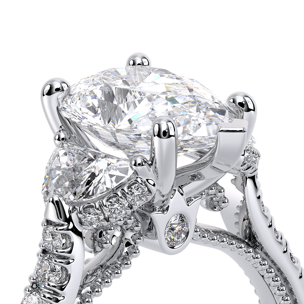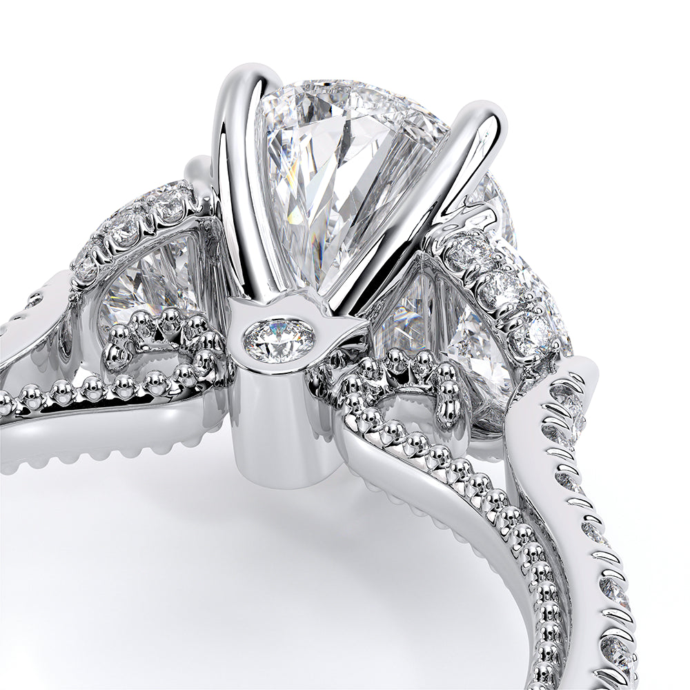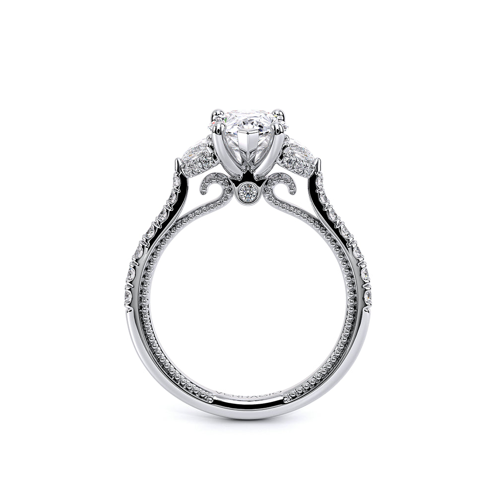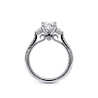Couture-0485PS is a distinctive three-stone engagement ring featuring half-moon diamond side-stones. The diamond shank is adorned with Verragio signature beading and beautiful scrolls sweep under the center mounting. The Verragio signature crest completes the sophistication of this piece.