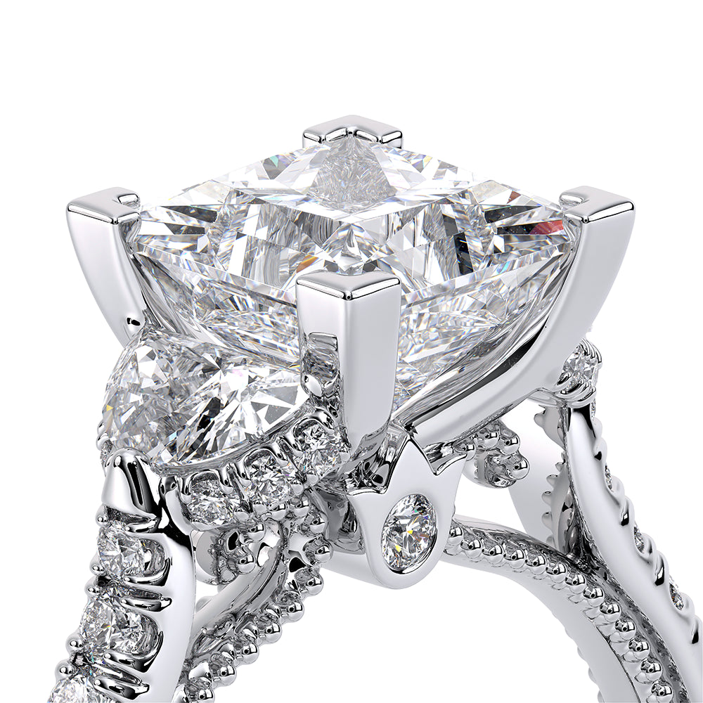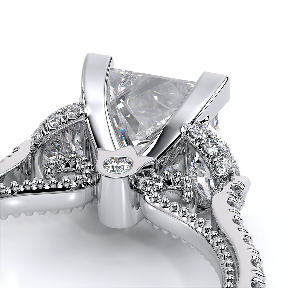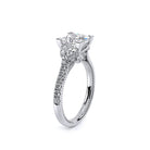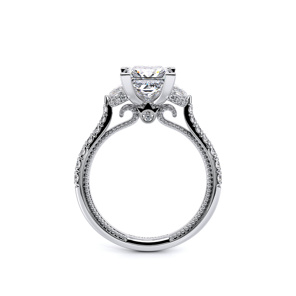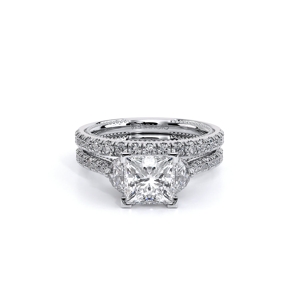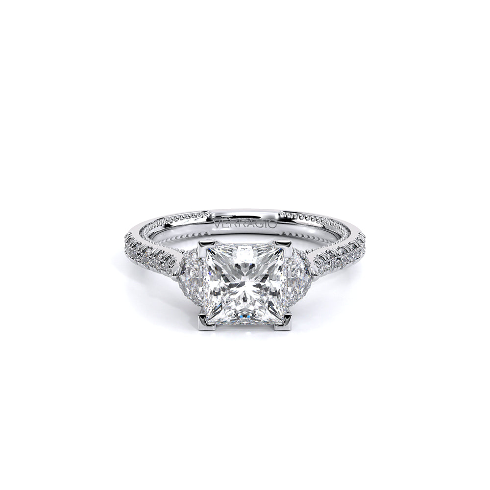 Couture-0485P is a distinctive three-stone engagement ring featuring half-moon diamond side-stones. The diamond shank is adorned with Verragio signature beading and beautiful scrolls sweep under the center mounting. The Verragio signature crest completes the sophistication of this piece.