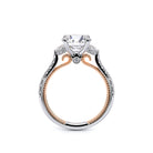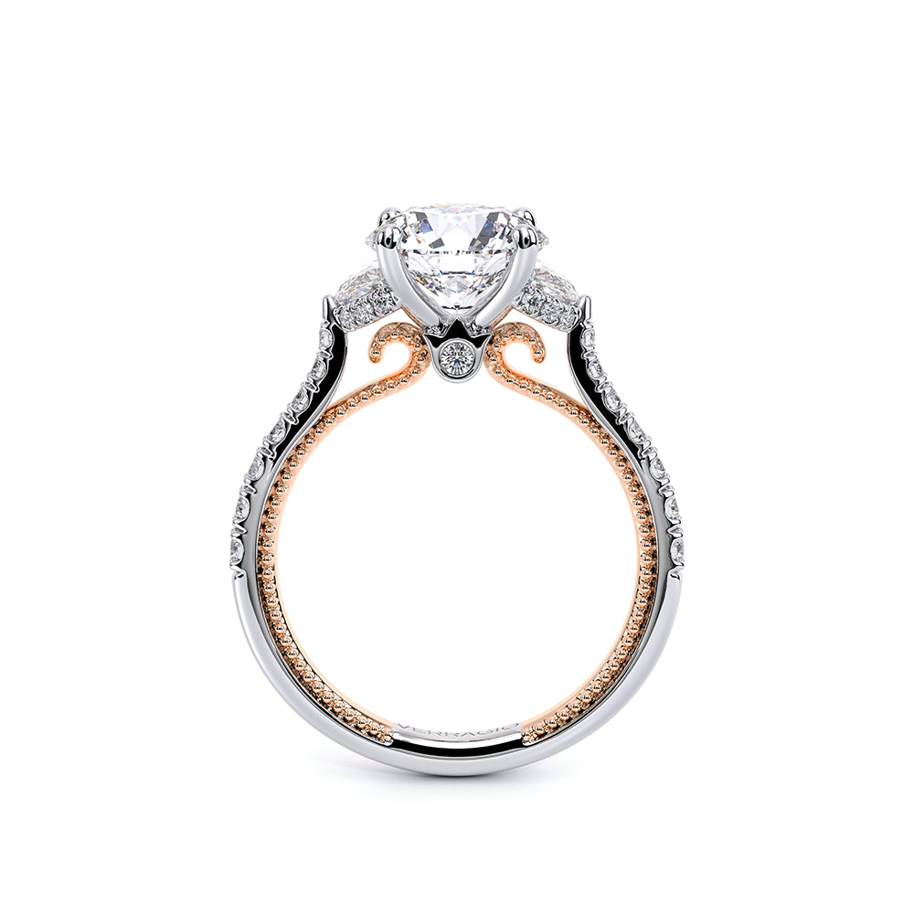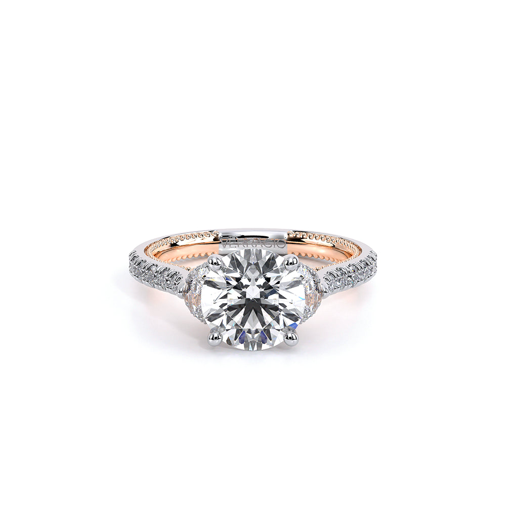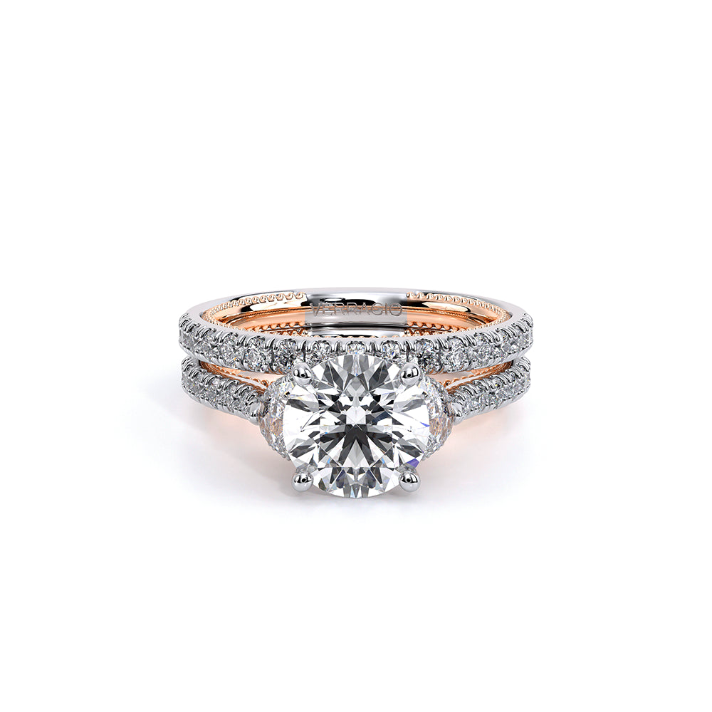 Couture-0485R is a distinctive three-stone engagement ring featuring half-moon diamond side-stones. The diamond shank is adorned with Verragio signature beading and beautiful scrolls sweep under the center mounting. The Verragio signature crest completes the sophistication of this piece.