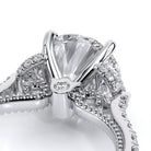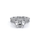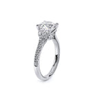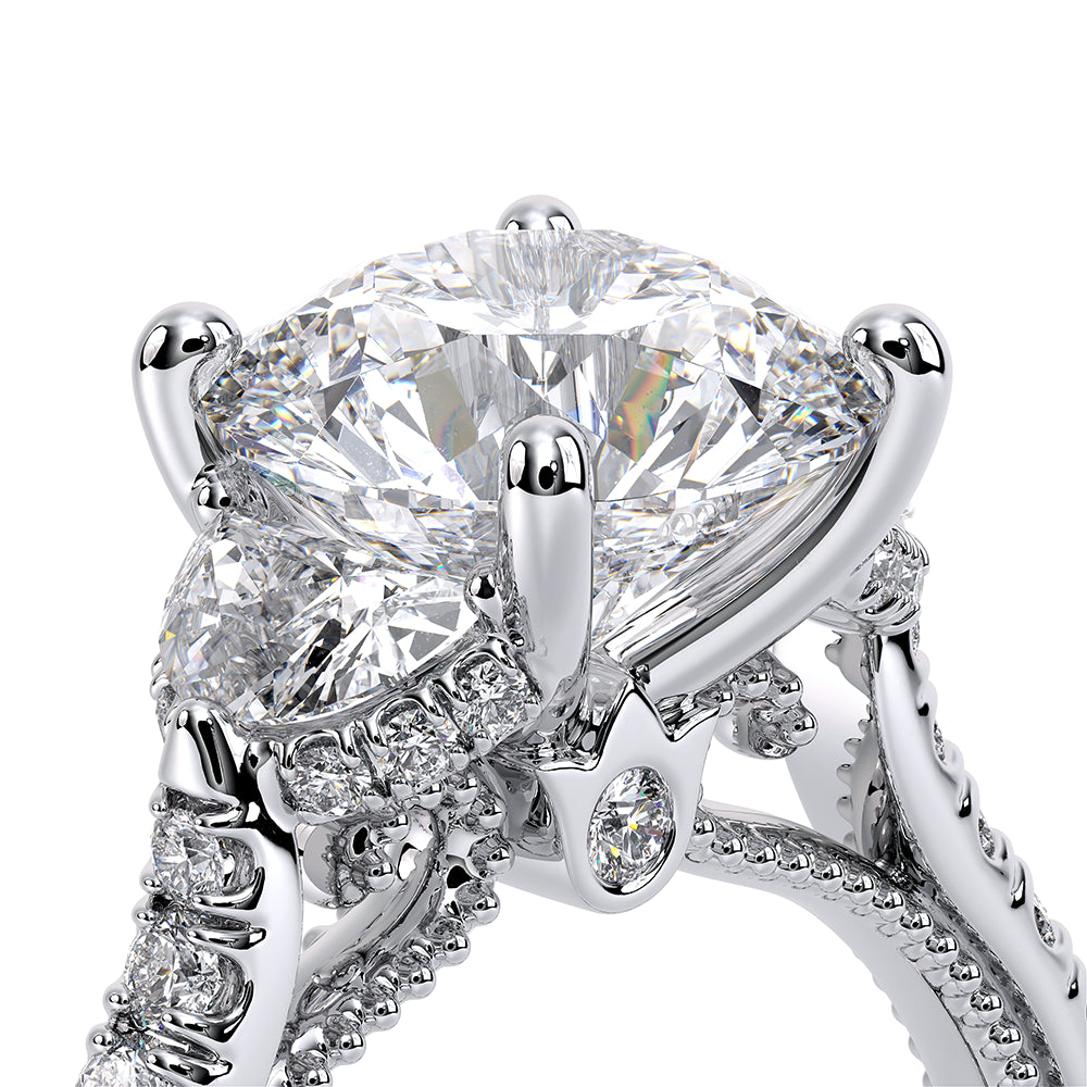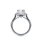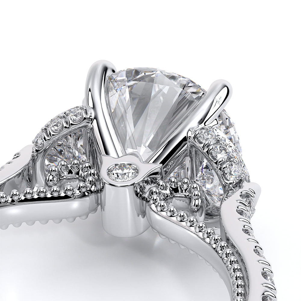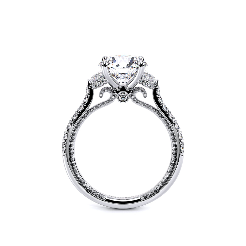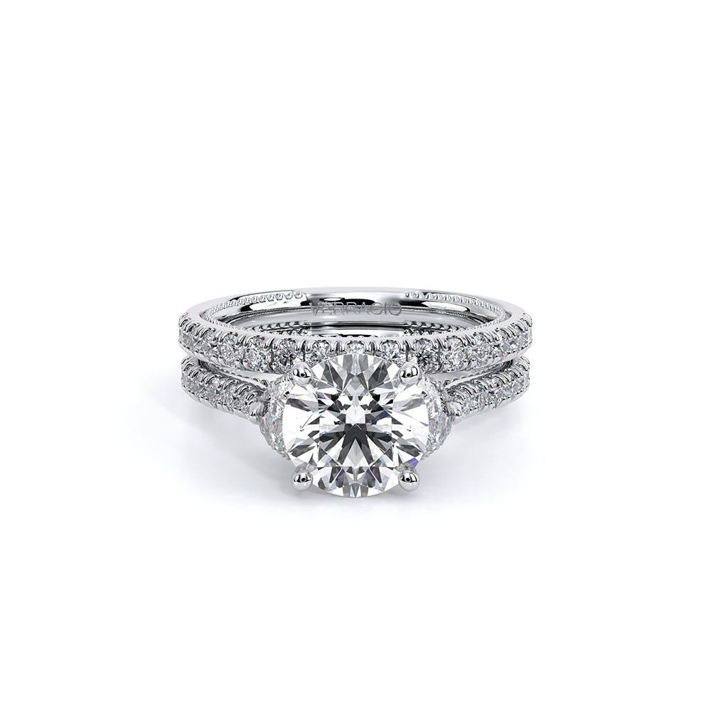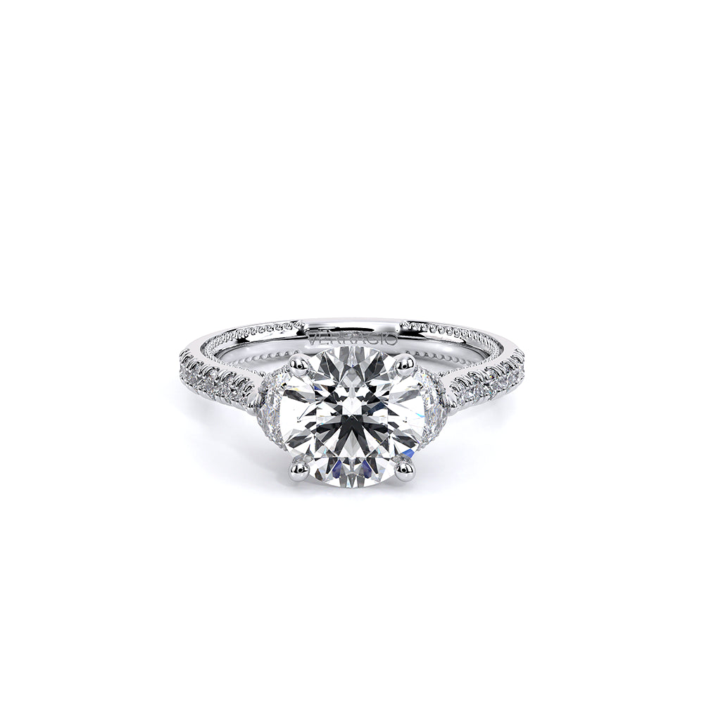 Couture-0485R is a distinctive three-stone engagement ring featuring half-moon diamond side-stones. The diamond shank is adorned with Verragio signature beading and beautiful scrolls sweep under the center mounting. The Verragio signature crest completes the sophistication of this piece.