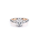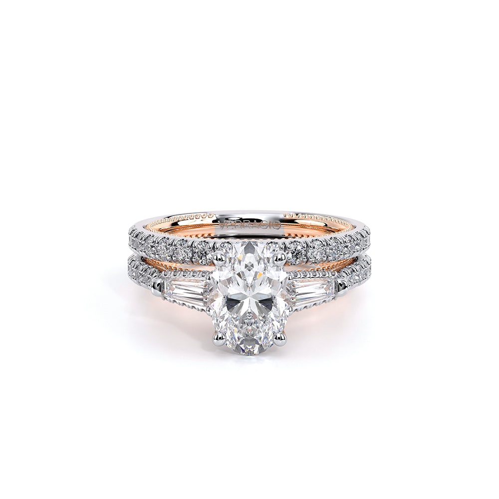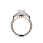 Couture-0486OV is a glamorous three-stone engagement ring featuring baguette diamond side-stones. Pave diamonds beautifully frame your center stone; the diamond shank adorned with Verragio signature beading elevates this ring with cultivated beauty. The Verragio signature crest completes the sophistication of this piece.