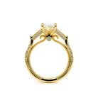 Couture-0486PS is a glamorous three-stone engagement ring featuring baguette diamond side-stones. Pave diamonds beautifully frame your center stone; the diamond shank adorned with Verragio signature beading elevates this ring with cultivated beauty. The Verragio signature crest completes the sophistication of this piece.