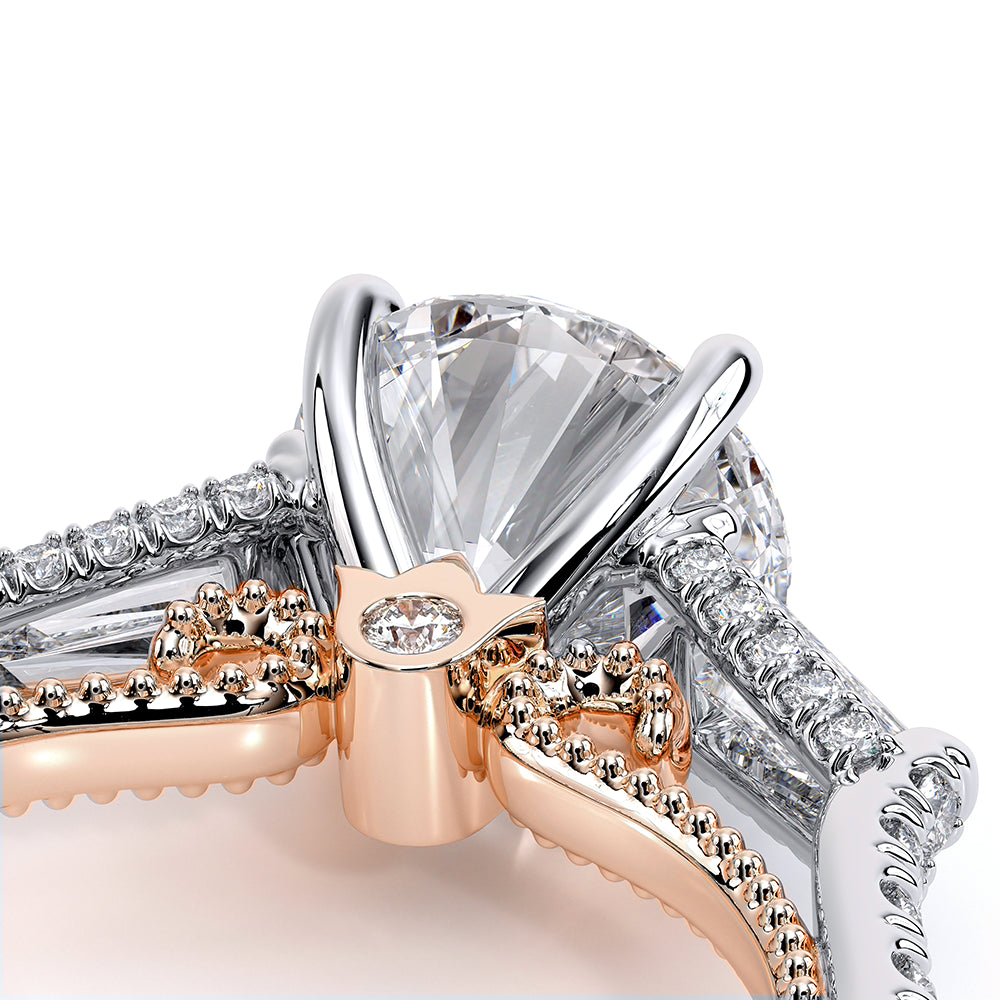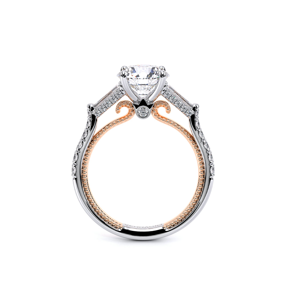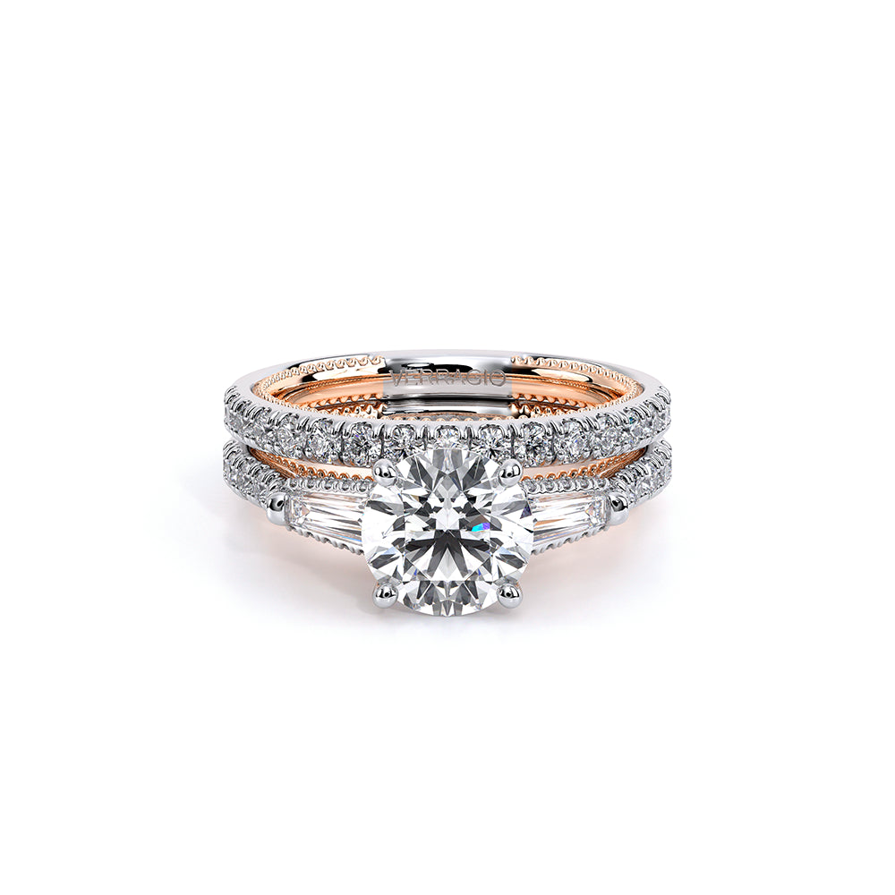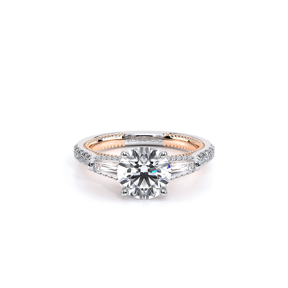 Couture-0486R is a glamorous three-stone engagement ring featuring baguette diamond side-stones. Pave diamonds beautifully frame your center stone; the diamond shank adorned with Verragio signature beading elevates this ring with cultivated beauty. The Verragio signature crest completes the sophistication of this piece.