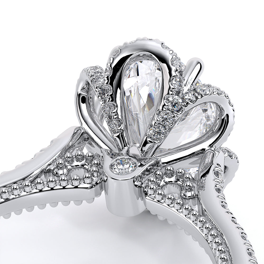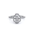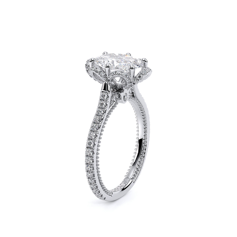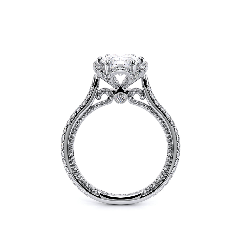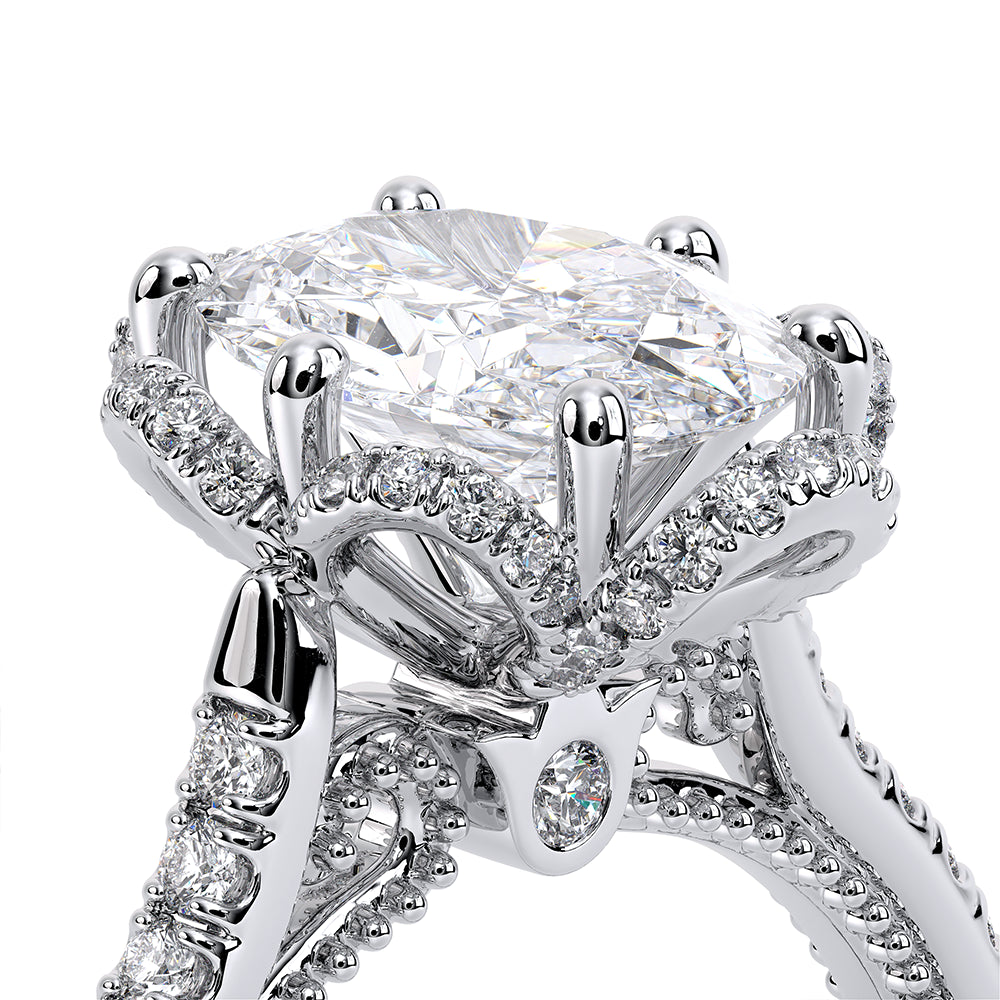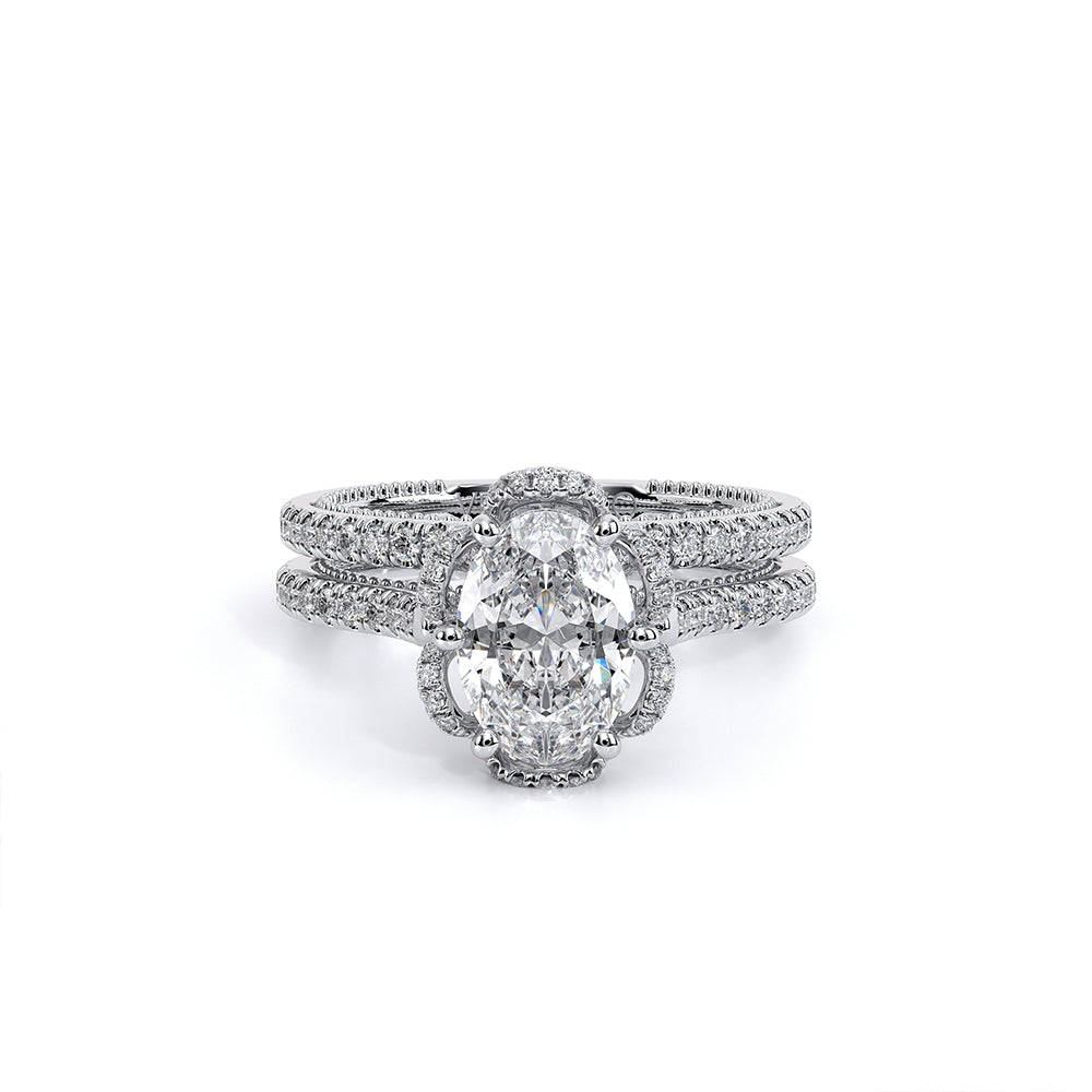 Couture-0487OV boasts a pave-set diamond Floral Tiara created to highlight your center stone. Its classic cathedral setting, adorned with a pave-set diamond band, seamlessly unites Verragio's iconic crest and signature beading for a harmonious and captivating design.