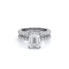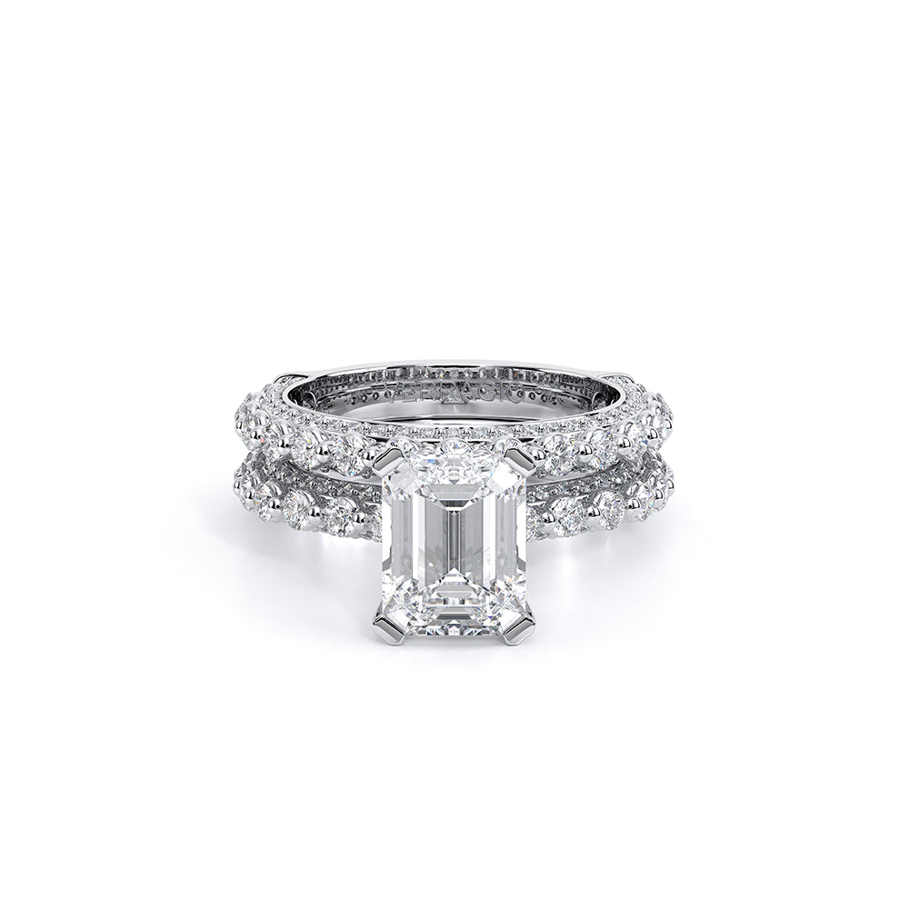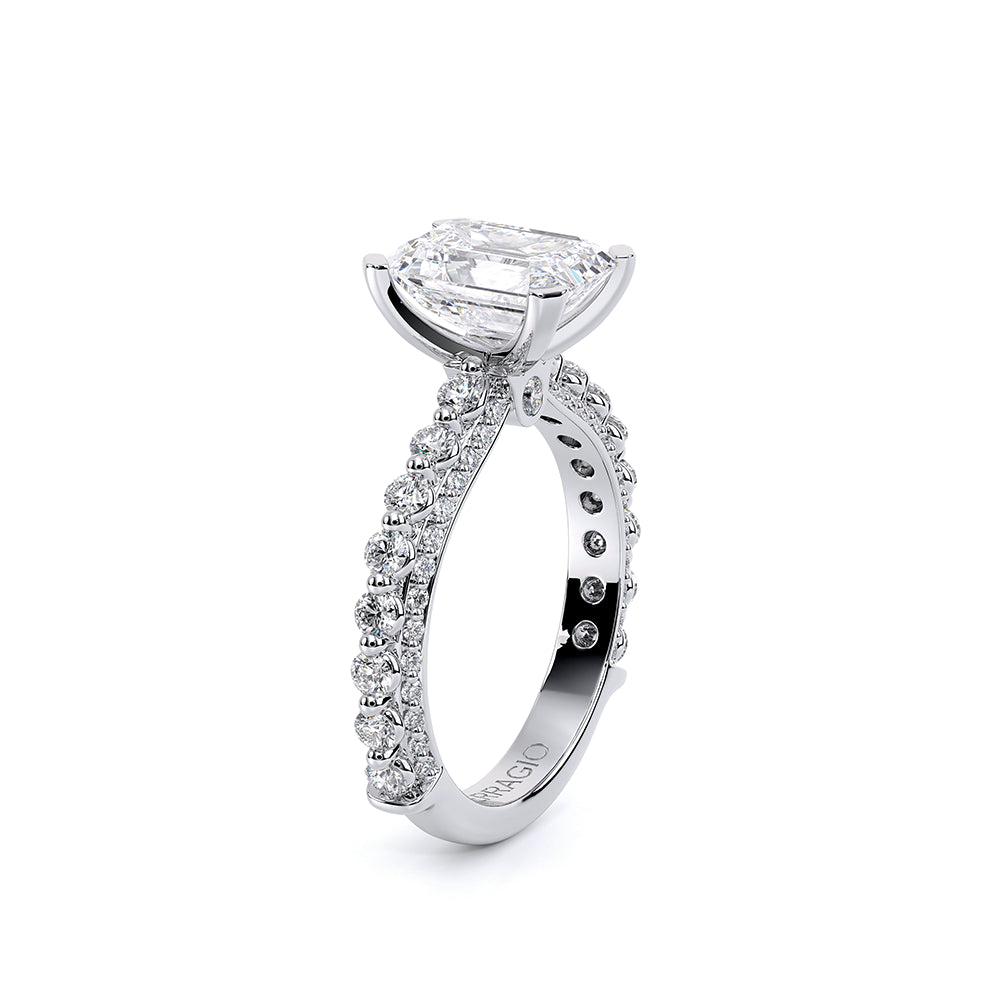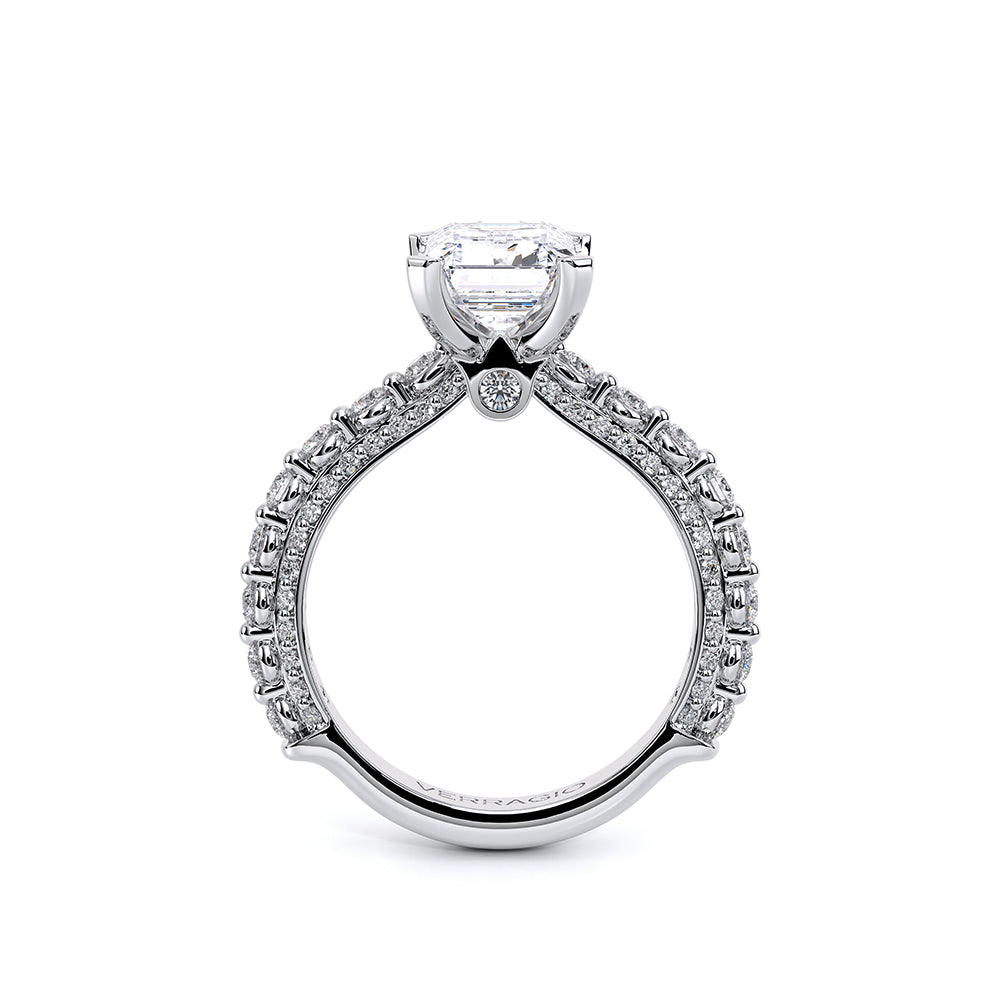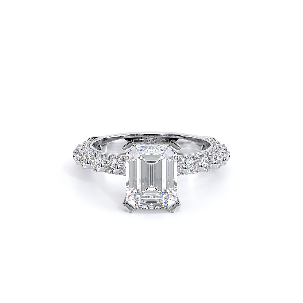Couture-0488EM20 is an elevated four-prong engagement setting designed to highlight your center stone. Meticulously-set round diamonds in a shared-prong setting wrap the elegant shank, enhanced with a pave-set three-quarter diamond riviera. The Verragio signature crest completes the statement look.