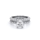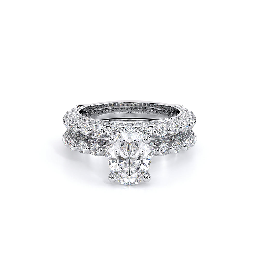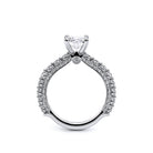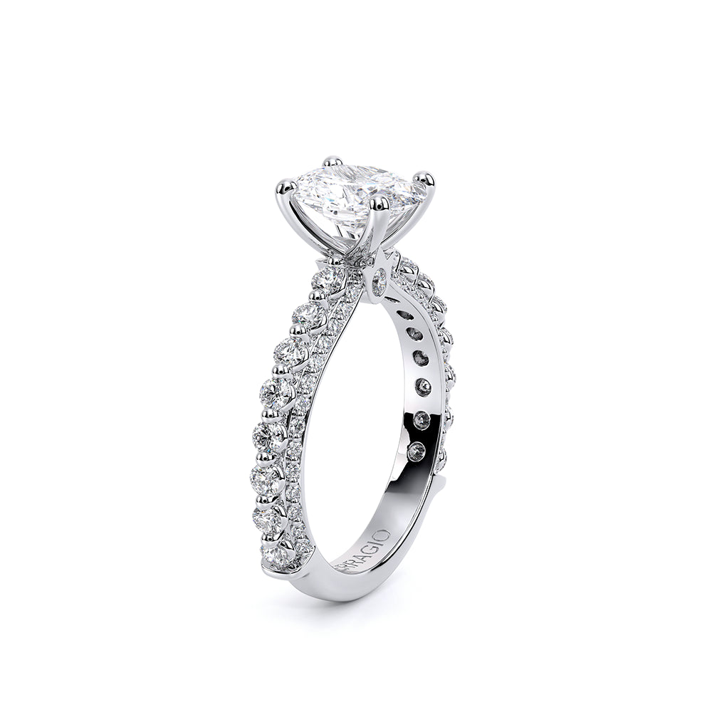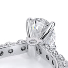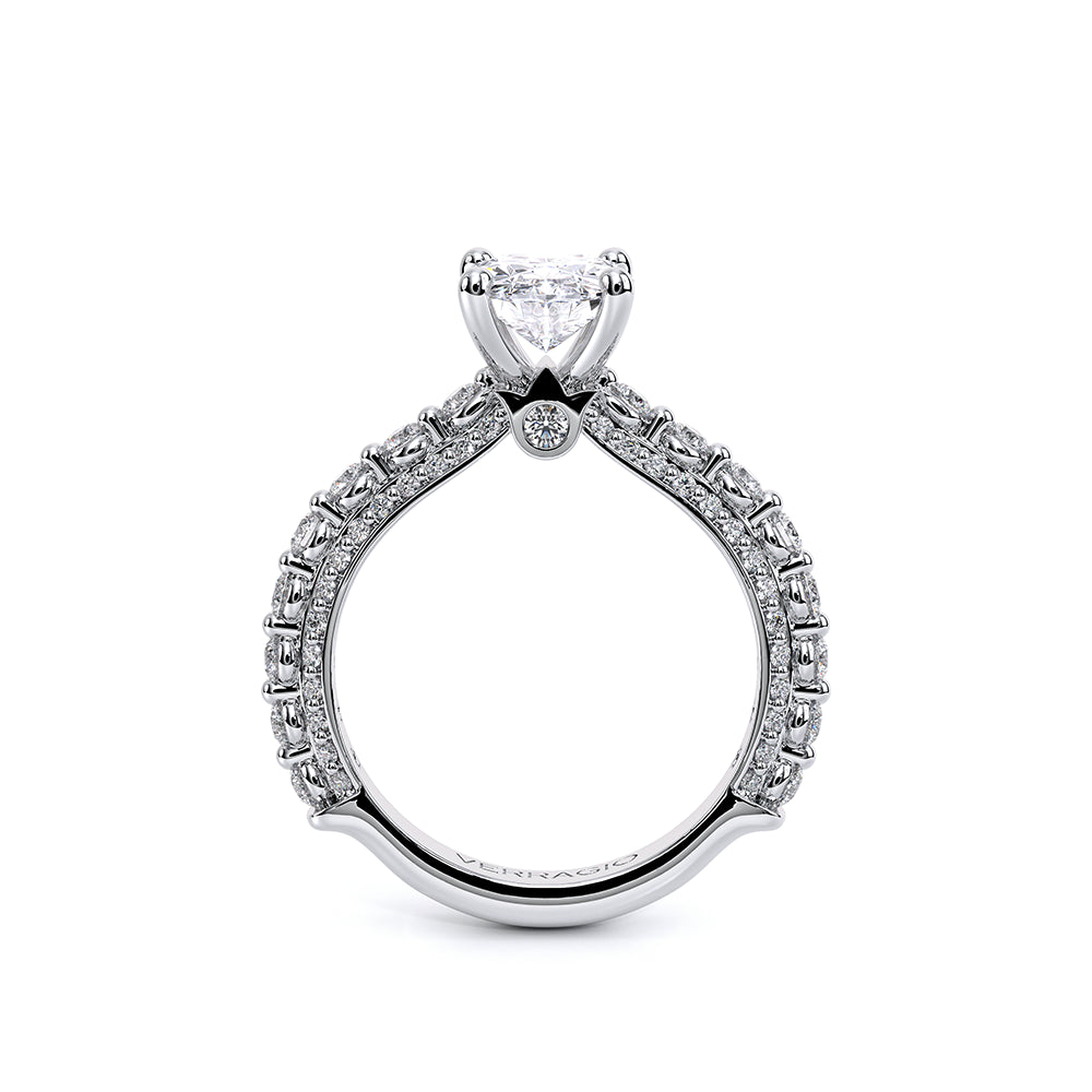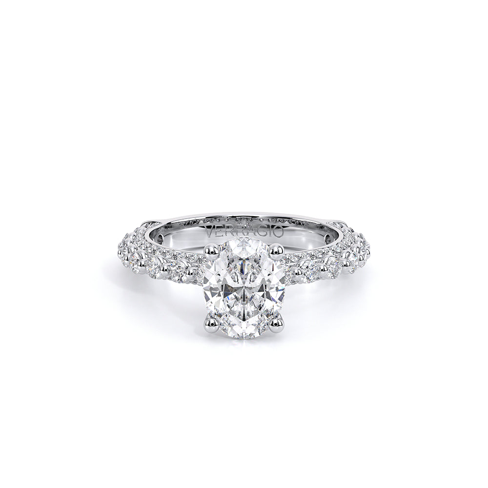 Couture-0488OV20 is an elevated four-prong engagement setting designed to highlight your center stone. Meticulously-set round diamonds in a shared-prong setting wrap the elegant shank, enhanced with a pave-set three-quarter diamond riviera. The Verragio signature crest completes the statement look.
