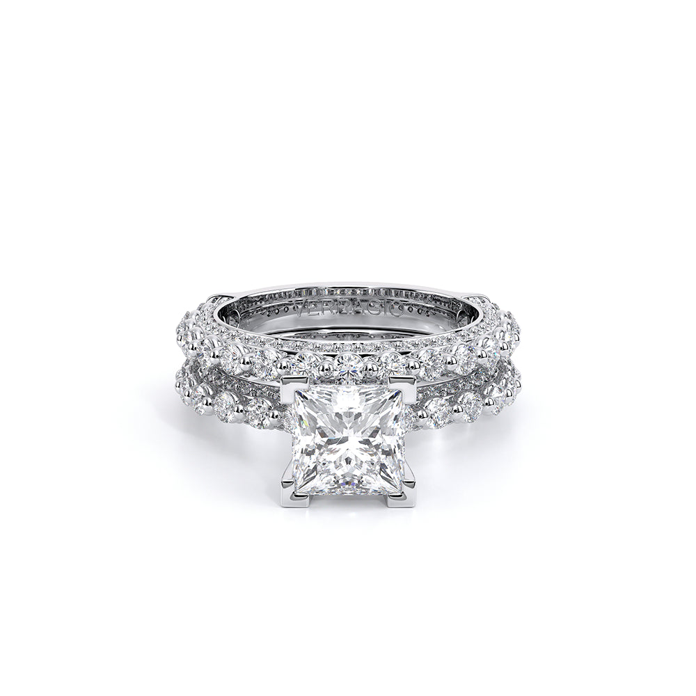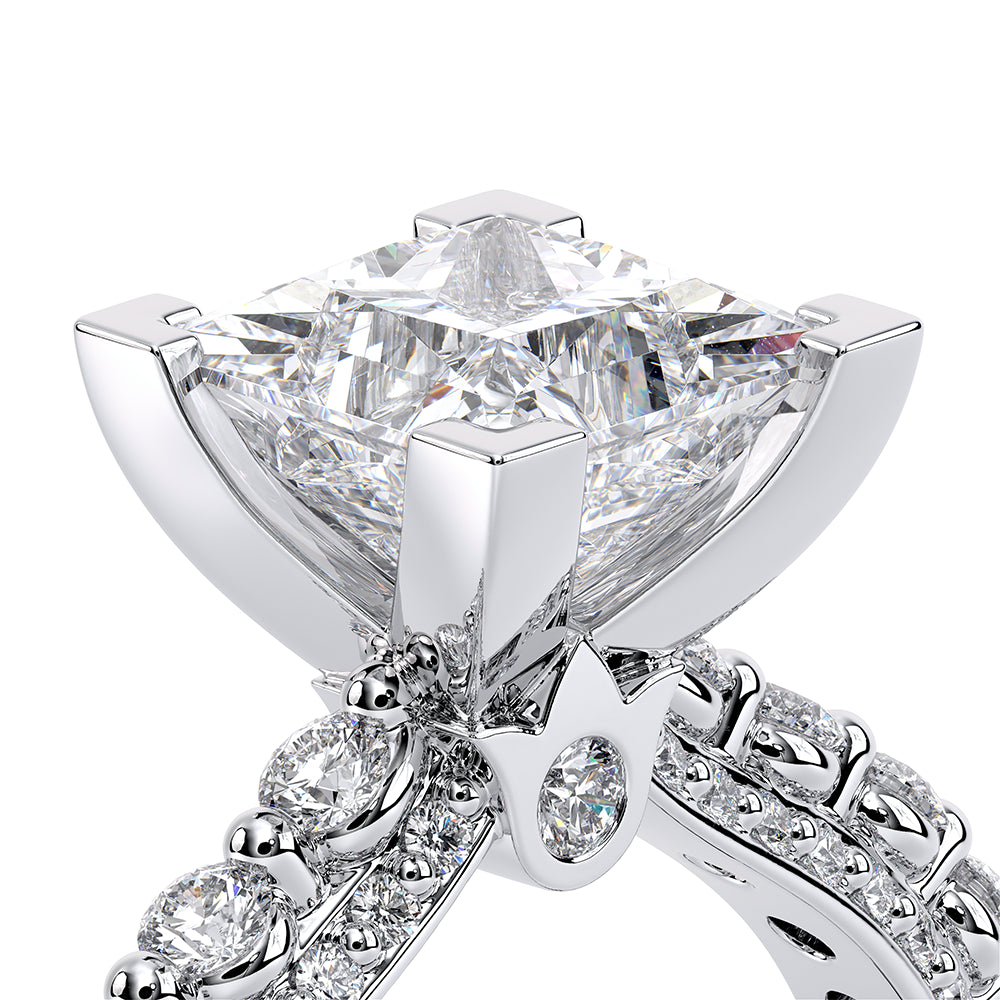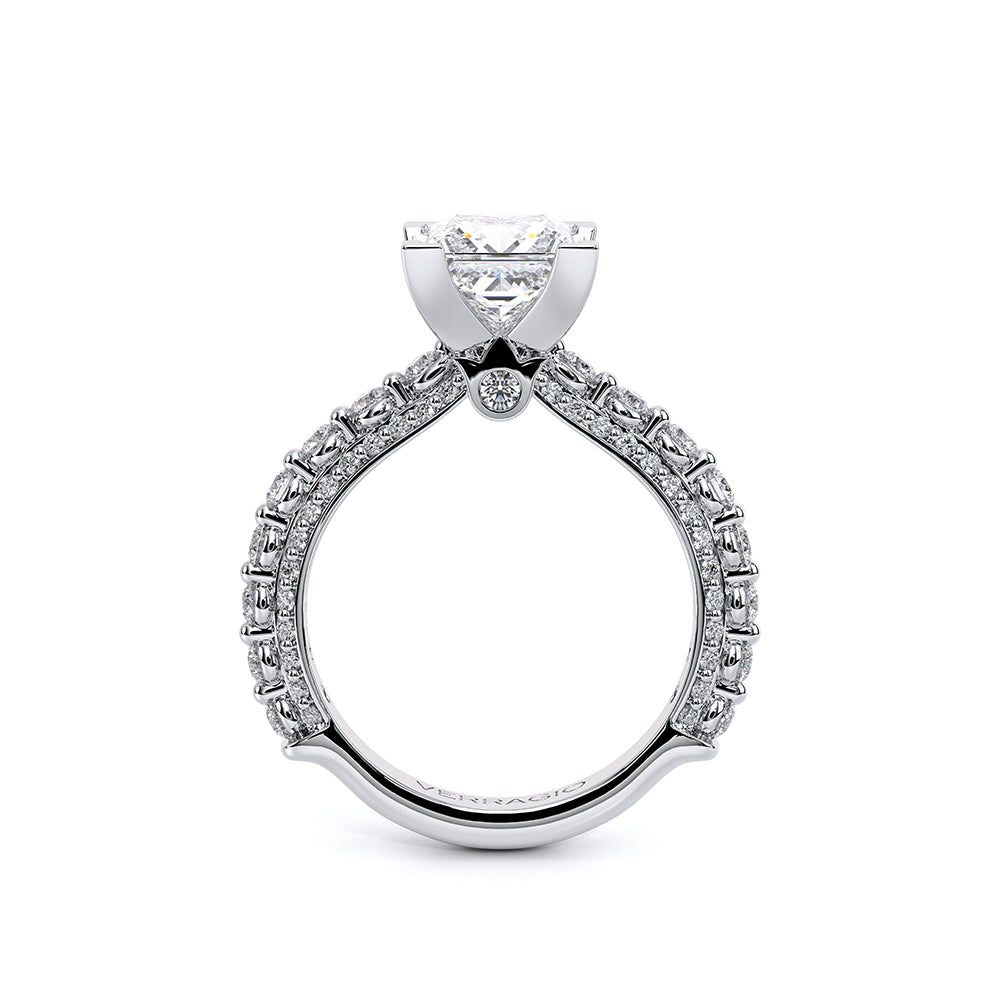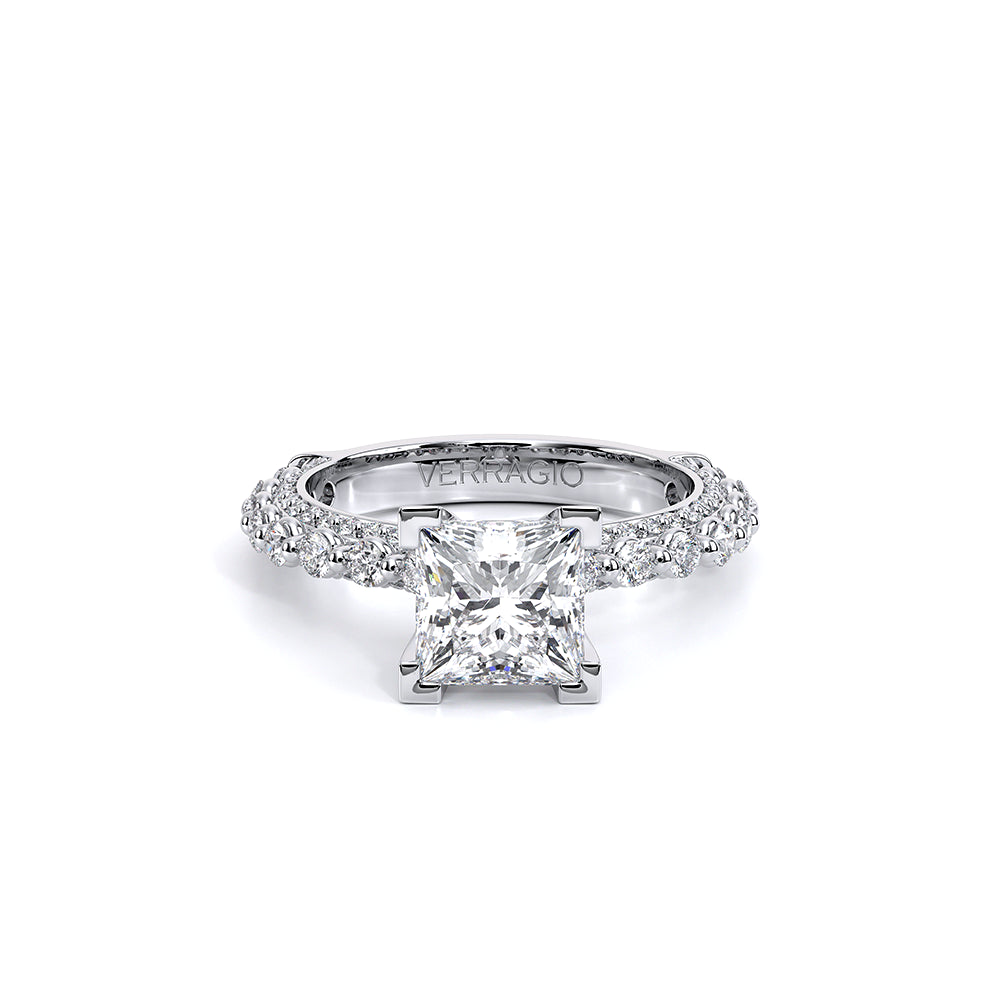 Couture-0488P20 is an elevated four-prong engagement setting designed to highlight your center stone. Meticulously-set round diamonds in a shared-prong setting wrap the elegant shank, enhanced with a pave-set three-quarter diamond riviera. The Verragio signature crest completes the statement look.