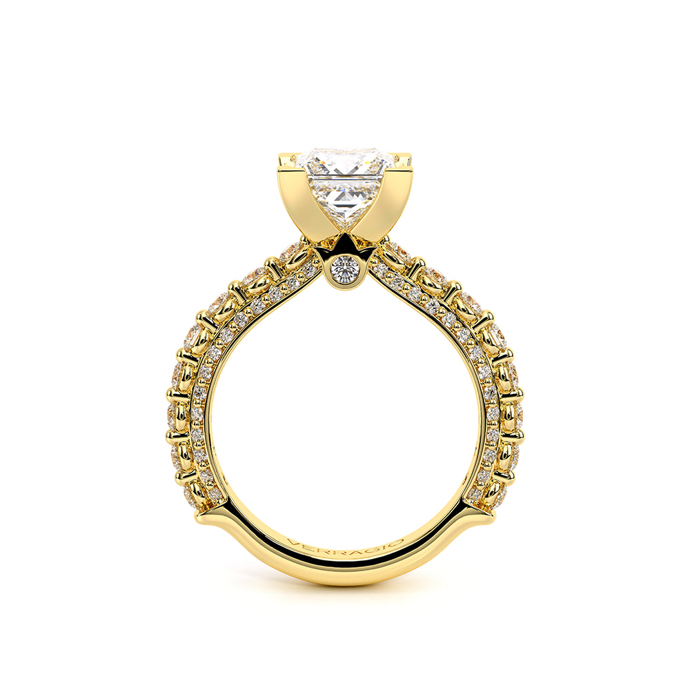 Couture-0488P20 is an elevated four-prong engagement setting designed to highlight your center stone. Meticulously-set round diamonds in a shared-prong setting wrap the elegant shank, enhanced with a pave-set three-quarter diamond riviera. The Verragio signature crest completes the statement look.