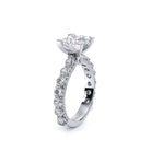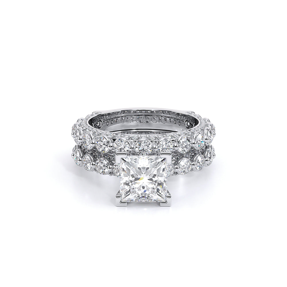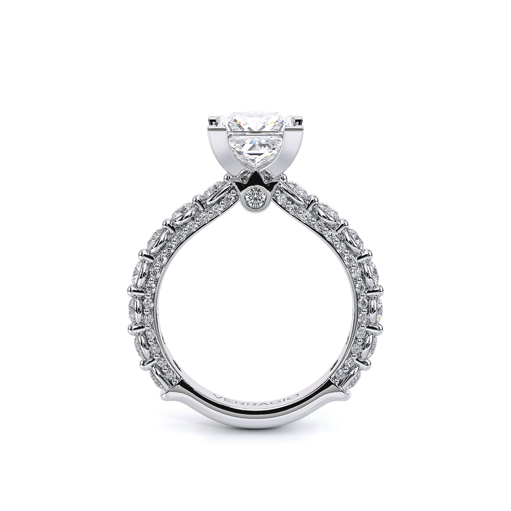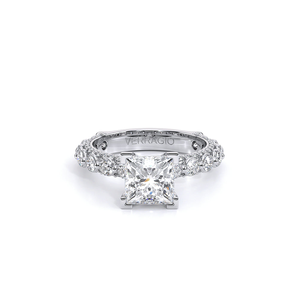 Couture-0488P2.5 is an elevated four-prong engagement setting designed to highlight your center stone. Meticulously-set round diamonds in a shared-prong setting wrap the elegant shank, enhanced with a pave-set three-quarter diamond riviera. This statement look is perfected with the distinctive Verragio signature crest.