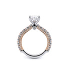 Couture-0488PS20 is an elevated four-prong engagement setting designed to highlight your center stone. Meticulously-set round diamonds in a shared-prong setting wrap the elegant shank, enhanced with a pave-set three-quarter diamond riviera. The Verragio signature crest completes the statement look.
