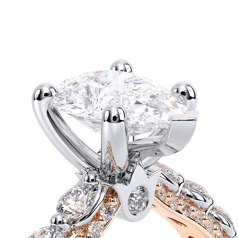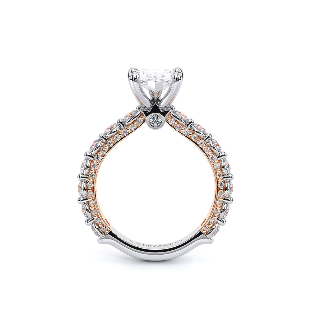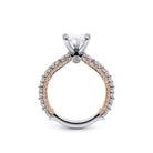 Couture-0488PS2.5 is an elevated four-prong engagement setting designed to highlight your center stone. Meticulously-set round diamonds in a shared-prong setting wrap the elegant shank, enhanced with a pave-set three-quarter diamond riviera. This statement look is perfected with the distinctive Verragio signature crest.