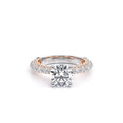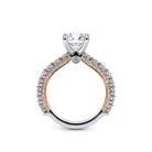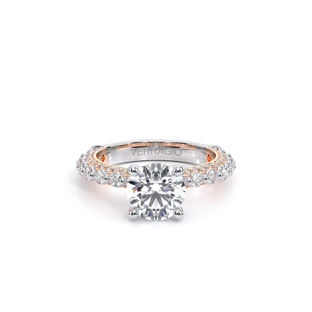 Couture-0488R20 is an elevated four-prong engagement setting designed to highlight your center stone. Meticulously-set round diamonds in a shared-prong setting wrap the elegant shank, enhanced with a pave-set three-quarter diamond riviera. The Verragio signature crest completes the statement look.