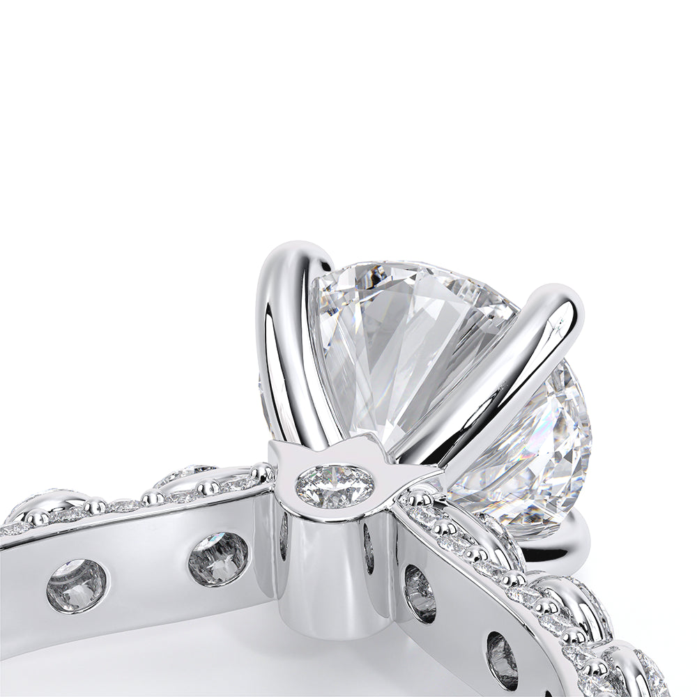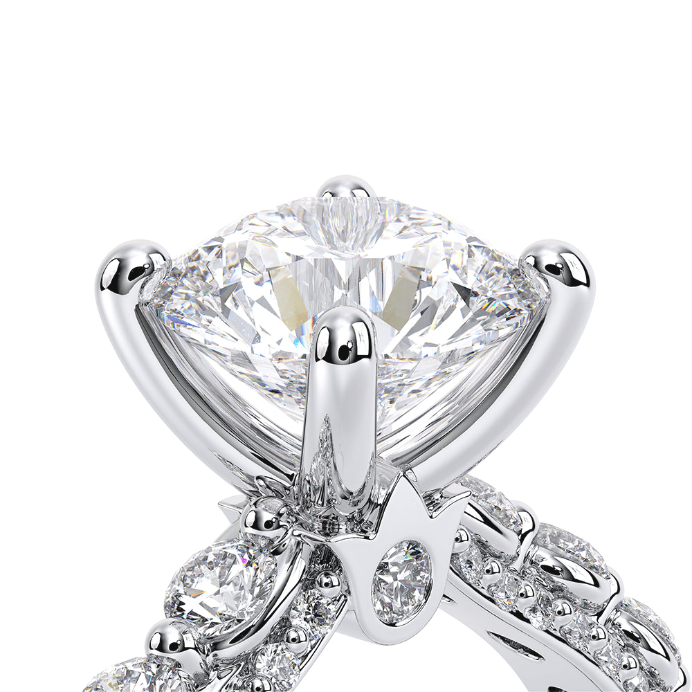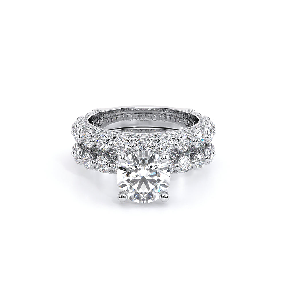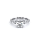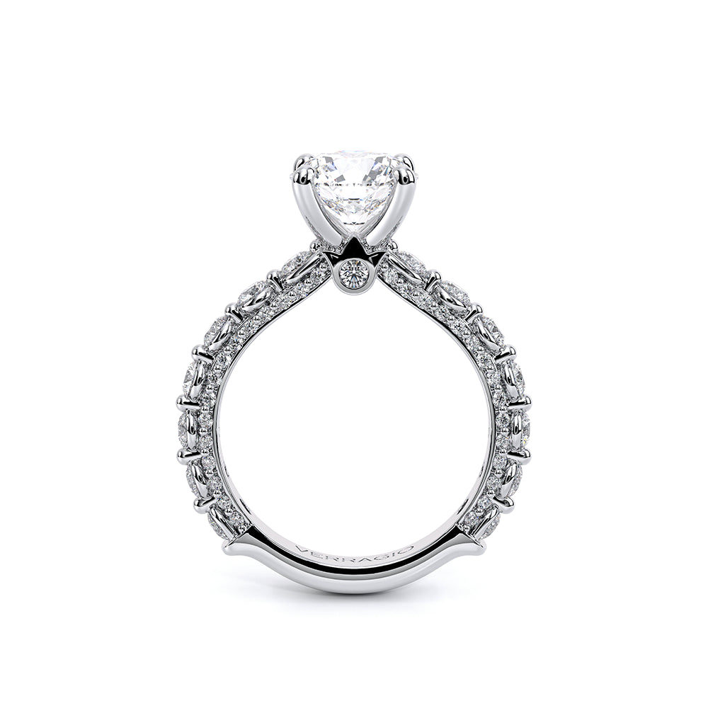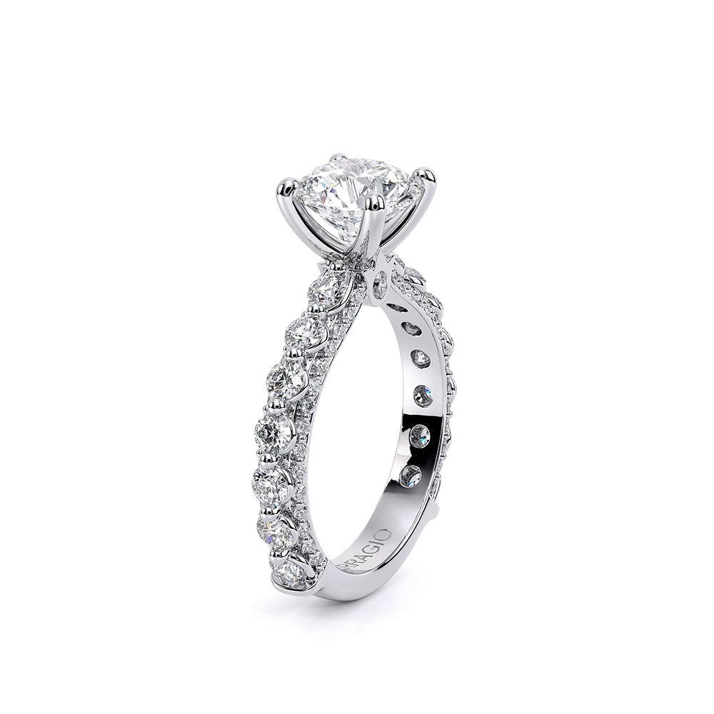 Couture-0488R2.5 is an elevated four-prong engagement setting designed to highlight your center stone. Meticulously-set round diamonds in a shared-prong setting wrap the elegant shank, enhanced with a pave-set three-quarter diamond riviera. This statement look is perfected with the distinctive Verragio signature crest.