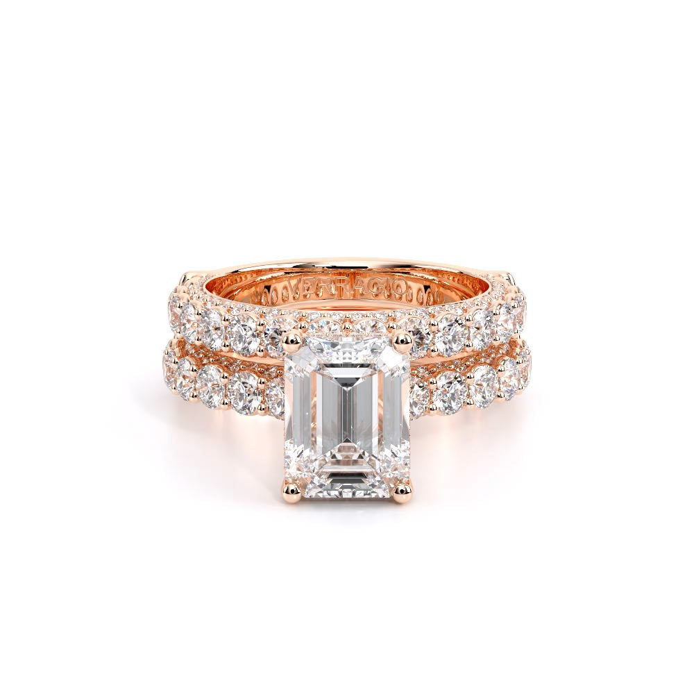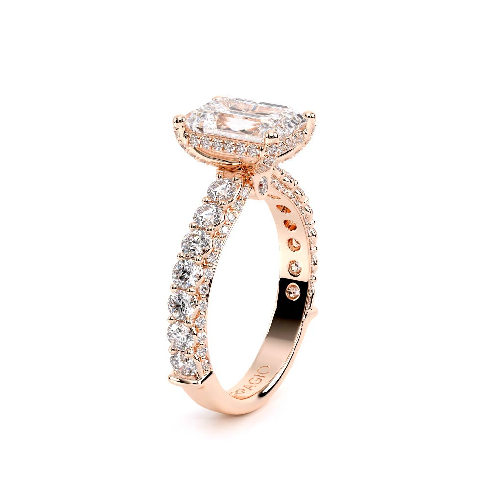 Couture-0489EM-2.5 is an elevated four-prong engagement ring featuring a diamond-bridge head designed to highlight your center stone. Meticulously-set round diamonds in a shared-prong setting wrap the elegant shank, enhanced with a pave-set three-quarter diamond riviera. The Verragio signature crest completes the statement look.