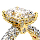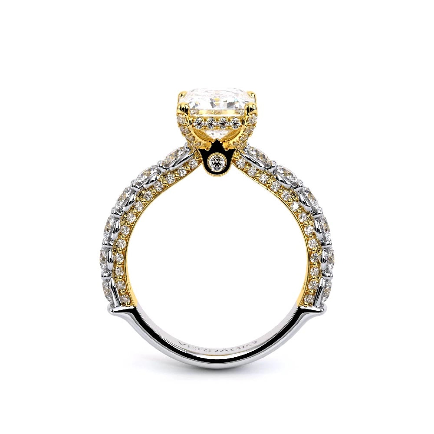 Couture-0489EM-3.0 is an elevated four-prong engagement ring featuring a diamond-bridge head designed to highlight your center stone. Meticulously-set round diamonds in a shared-prong setting wrap the elegant shank, enhanced with a pave-set three-quarter diamond riviera. The Verragio signature crest completes the statement look.