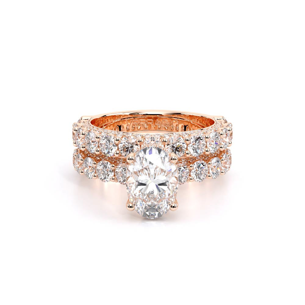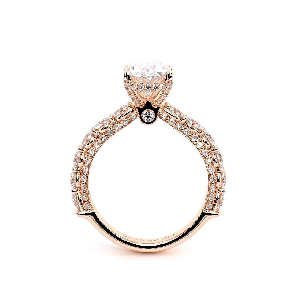 Couture-0489OV-3.0 is an elevated four-prong engagement ring featuring a diamond-bridge head designed to highlight your center stone. Meticulously-set round diamonds in a shared-prong setting wrap the elegant shank, enhanced with a pave-set three-quarter diamond riviera. The Verragio signature crest completes the statement look.