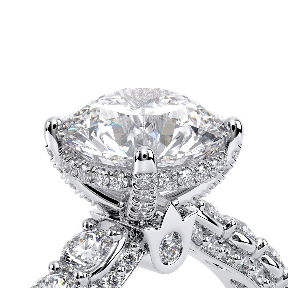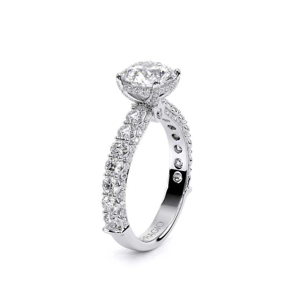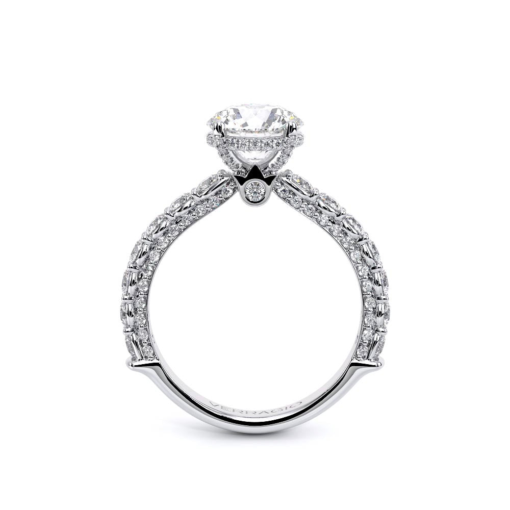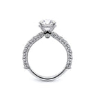Couture-0489R-2.5 is an elevated four-prong engagement ring featuring a diamond-bridge head designed to highlight your center stone. Meticulously-set round diamonds in a shared-prong setting wrap the elegant shank, enhanced with a pave-set three-quarter diamond riviera. The Verragio signature crest completes the statement look.