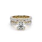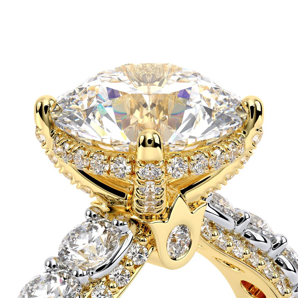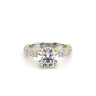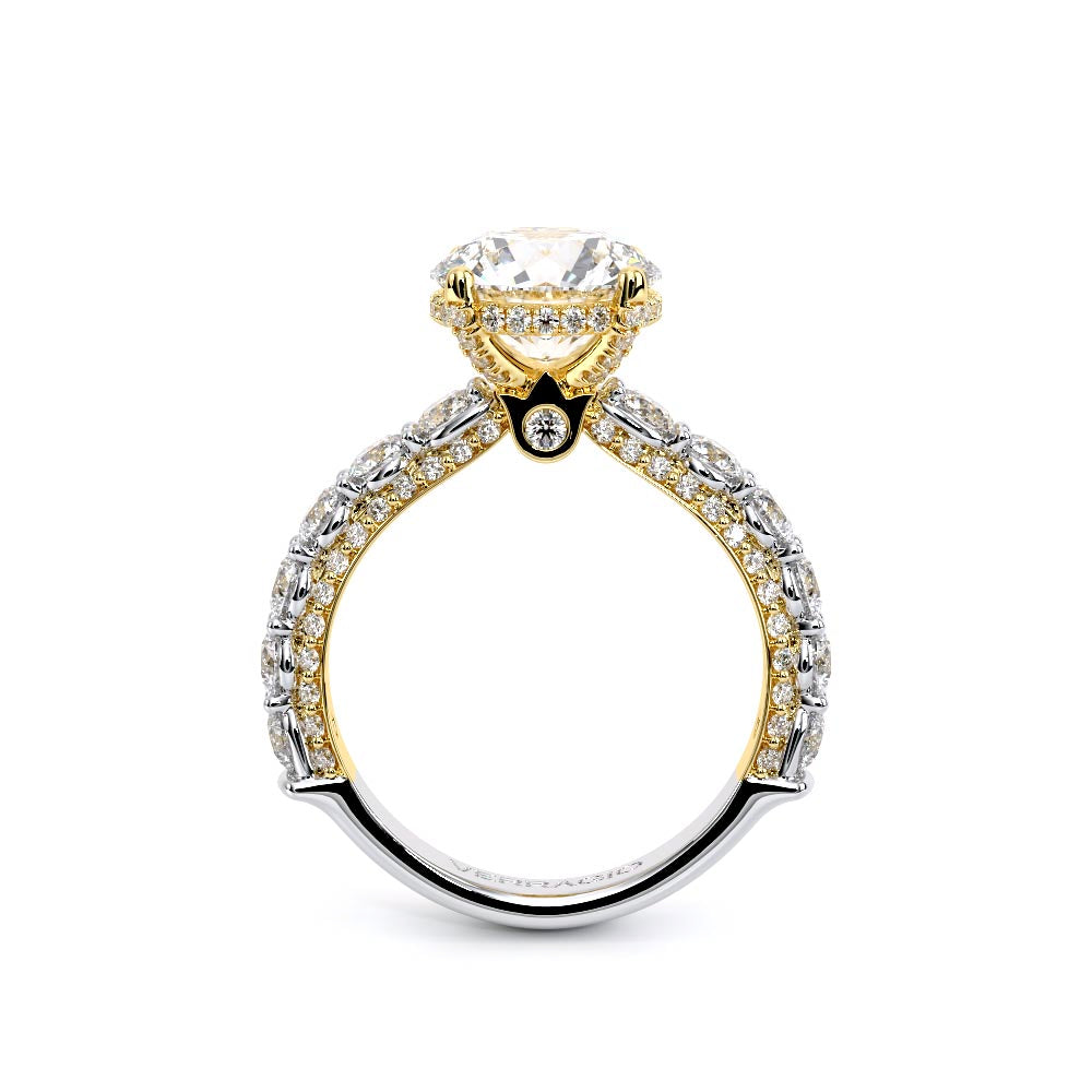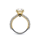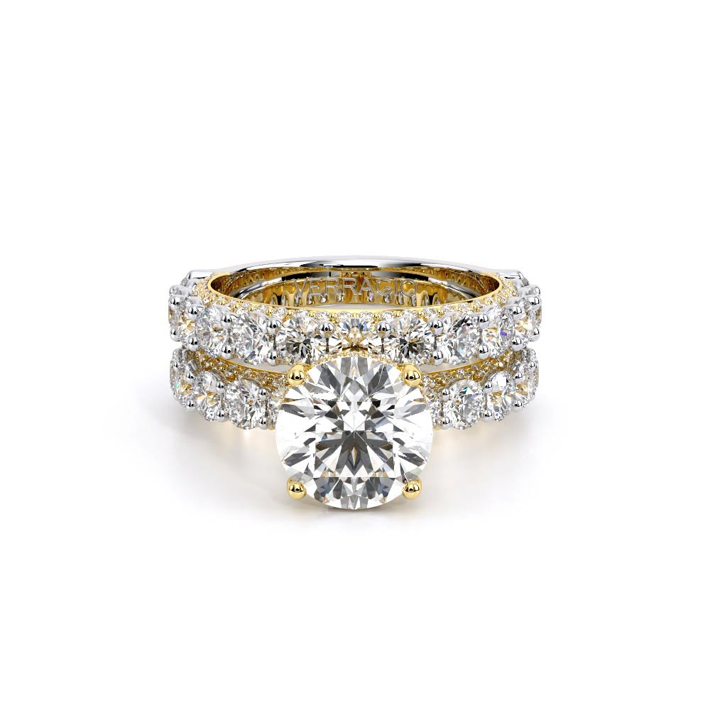 Couture-0489R-3.0 is an elevated four-prong engagement ring featuring a diamond-bridge head designed to highlight your center stone. Meticulously-set round diamonds in a shared-prong setting wrap the elegant shank, enhanced with a pave-set three-quarter diamond riviera. The Verragio signature crest completes the statement look.