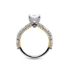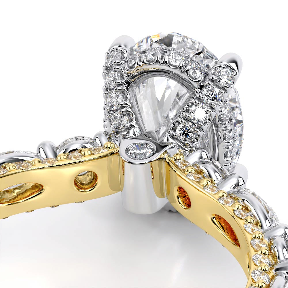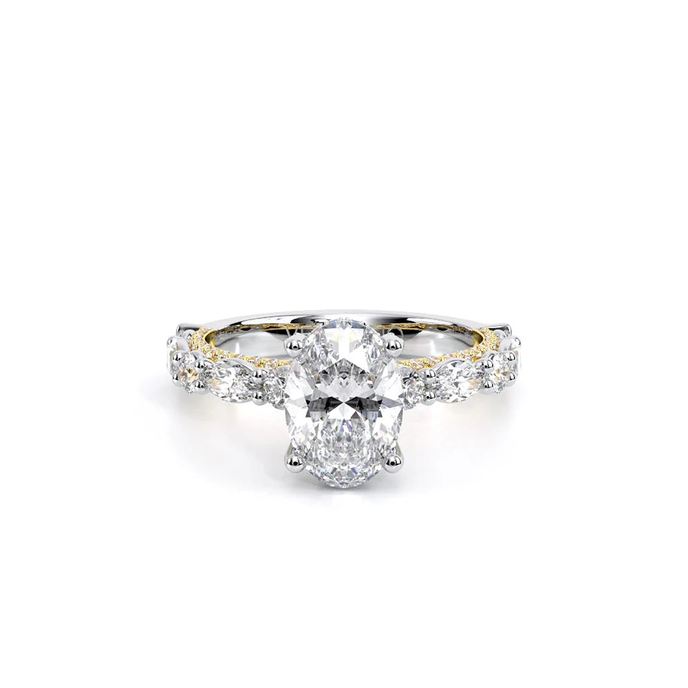 Couture-0490OV-2.5 is an elevated four-prong engagement ring featuring a diamond-bridge head designed to highlight your center stone. Meticulously-set alternating round and marquise diamonds in a shared-prong setting wrap the elegant shank, enhanced with a pave-set three-quarter diamond riviera. The Verragio signature crest completes the statement look.