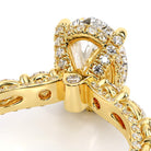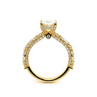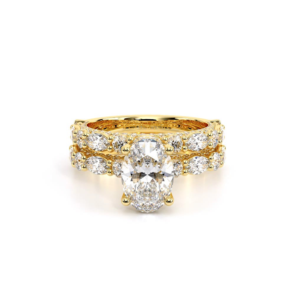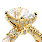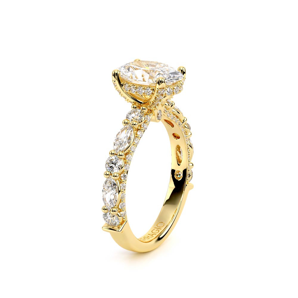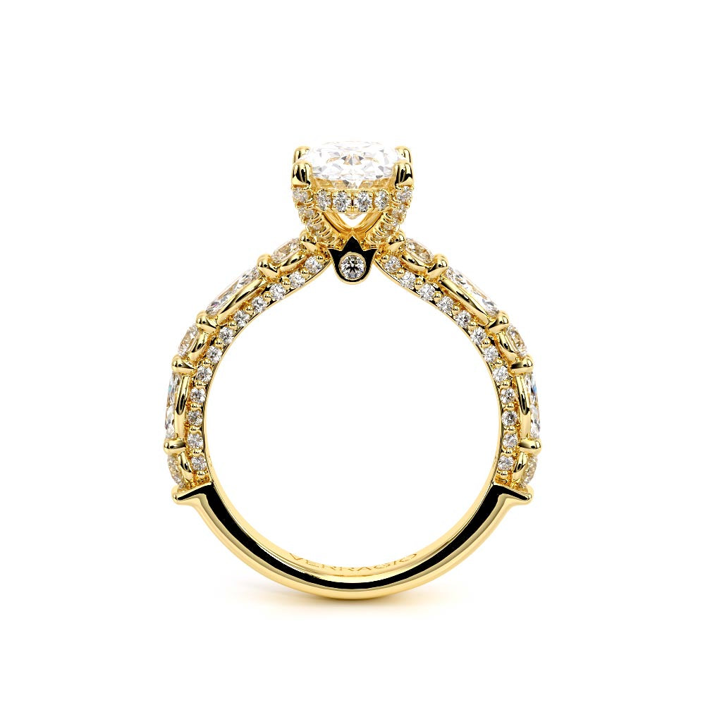 Couture-0490OV-2.5 is an elevated four-prong engagement ring featuring a diamond-bridge head designed to highlight your center stone. Meticulously-set alternating round and marquise diamonds in a shared-prong setting wrap the elegant shank, enhanced with a pave-set three-quarter diamond riviera. The Verragio signature crest completes the statement look.