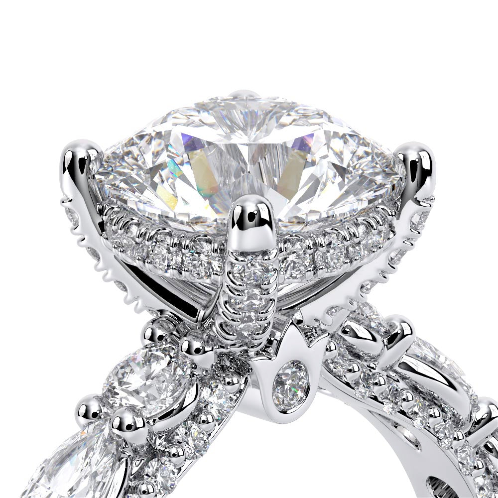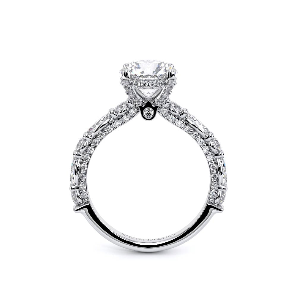 Couture-0490R-2.5 is an elevated four-prong engagement ring featuring a diamond-bridge head designed to highlight your center stone. Meticulously-set alternating round and marquise diamonds in a shared-prong setting wrap the elegant shank, enhanced with a pave-set three-quarter diamond riviera. The Verragio signature crest completes the statement look.